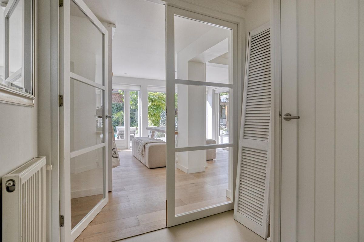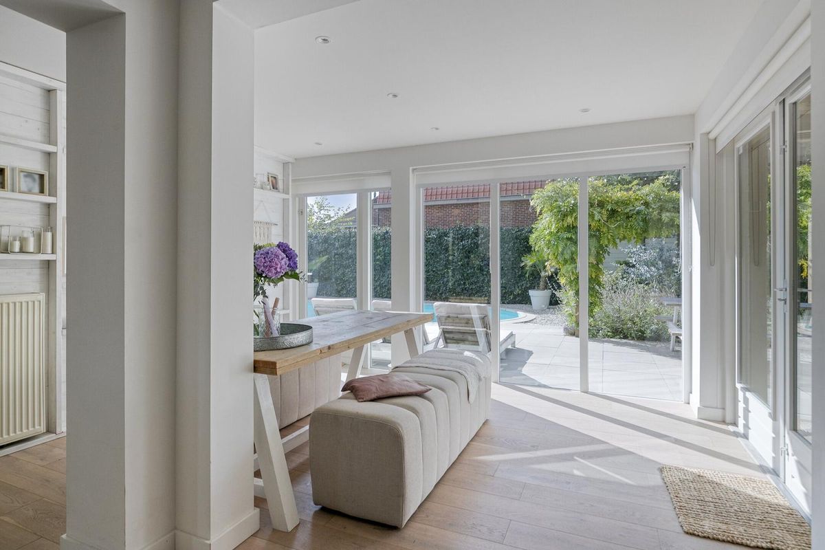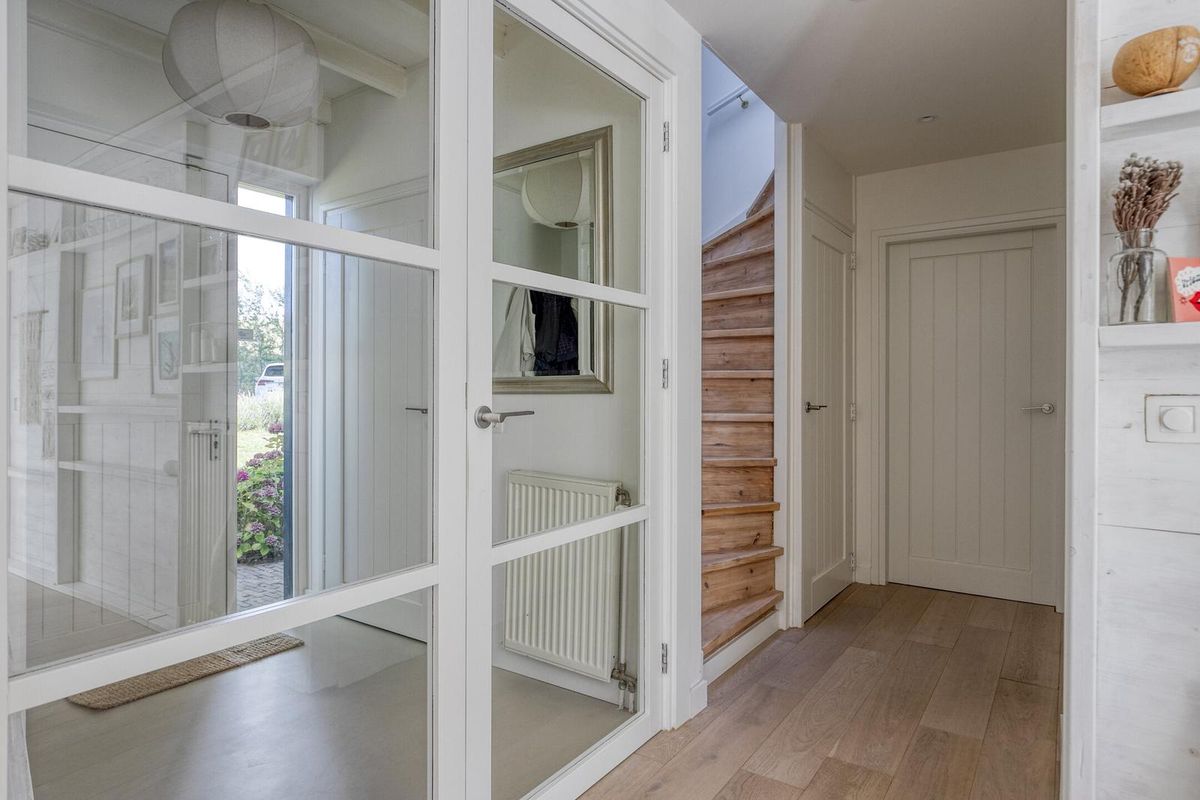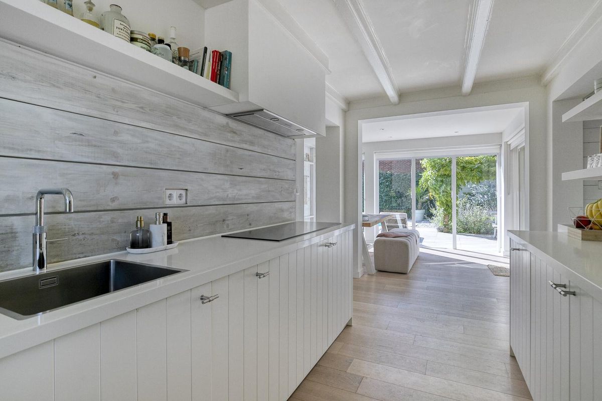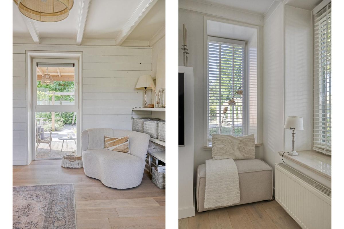 Via de glazen deur kom je in het royale leefgedeelte, wat speels verdeeld is in de woon-/zitkamer en eetkamer met half open keuken. Door gebruik van natuurlijke materialen en zachte kleuren, gezellige zithoek, grote ramen met veel natuurlijk licht die voor een heerlijke verbinding met de tuin zorgen, heerst er een rustgevende en ontspannen sfeer.