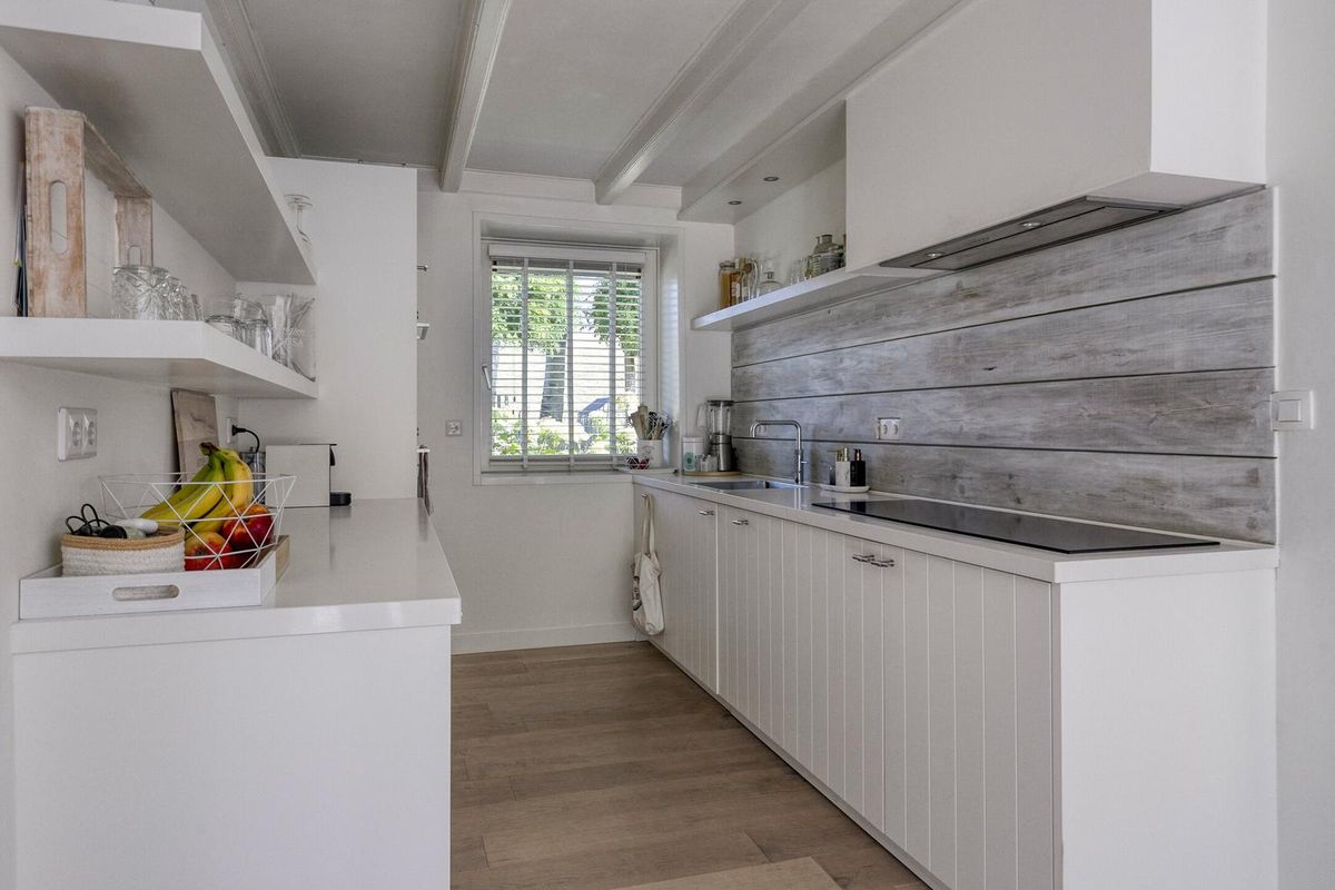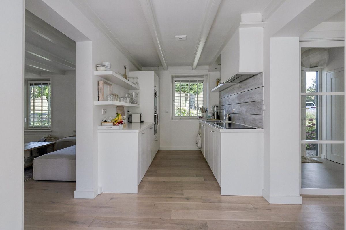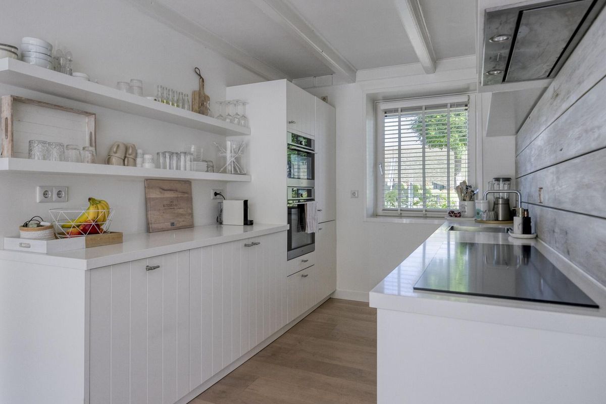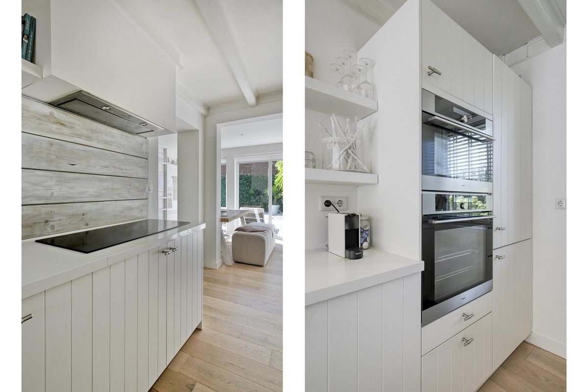 De modern landelijke keuken is tijdloos door zijn witte kastjes en compleet uitgevoerd. Voor de thuis chef is alle inbouwapparatuur aanwezig, zo is de keuken uitgevoerd met een ATAG inductiekookplaat voorzien van Celsius°Cooking, ingebouwde afzuigkap, combimagnetron, oven, koelkast, vriezer en vaatwasmachine.