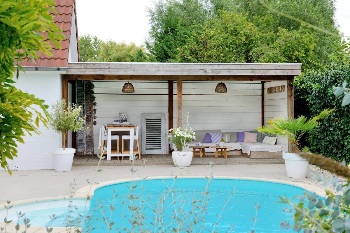 Droom jij al van warme zomerdagen in je tuin? Ontsnap dan aan de dagelijkse drukte in deze schitterende tuin. De tuin met overkappingen, buitenbar, zwembad en sauna biedt een comfortabele sfeer met veel natuurlijke materialen en sfeervolle verlichting voor de lange avonden buiten. Onder het genot van een hapje en drankje is deze tuin ideaal om optimaal van het buitenleven te genieten en hoef je zelfs het vliegtuig niet op om je op vakantie te voelen.