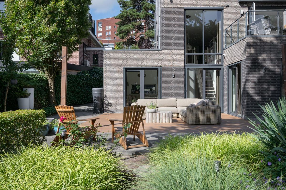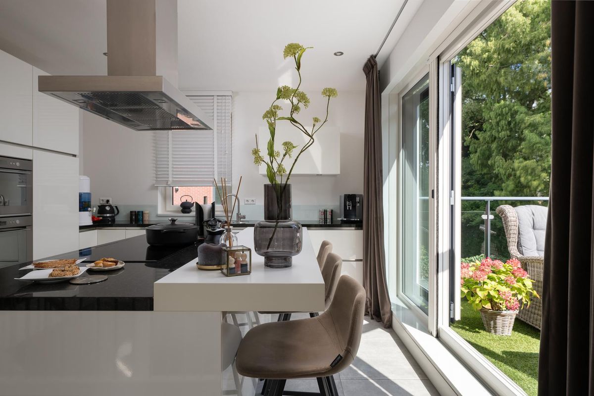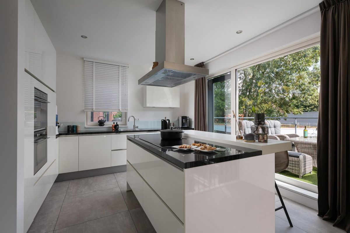 De leefetage wordt gekenmerkt door een zee aan licht en een serene elegantie. Openslaande deuren leiden naar een verhoogd terras dat uitzicht biedt over de parkachtige tuin. De moderne witte keuken met kookeiland en gezellige eetbar vormt het hart van dit niveau: een plek waar koken, tafelen en samenzijn moeiteloos samenkomen. Terwijl je dineert of nipt van een glas wijn, ontvouwt het uitzicht zich als een groen panorama dat je even doet vergeten dat je in de stad woont.