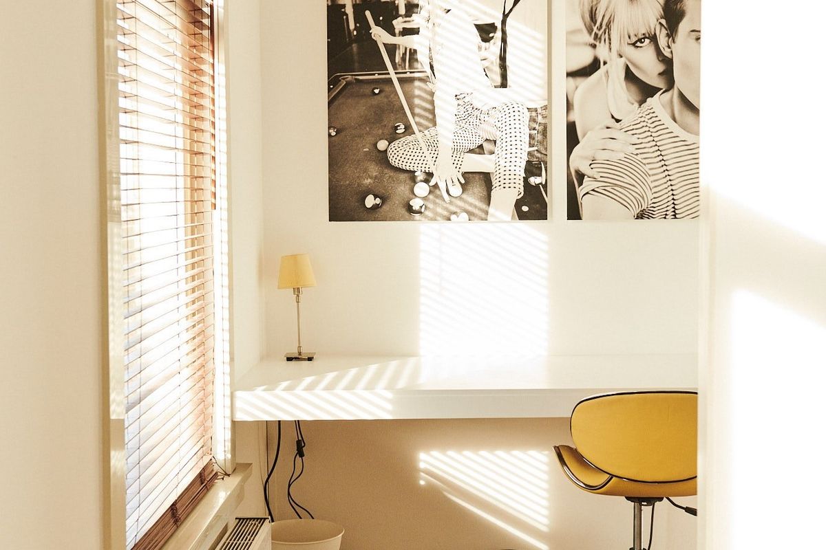 The entrance to the apartment is on the third floor, accessible via the communal staircase. Upon entering, you arrive in the bright living room, thanks to the windows at the front and the balcony at the rear. The rear balcony faces east and overlooks the inner gardens without any direct view from neighbors. The French balcony at the front offers a view over Westerpark. The open kitchen is equipped with a gas stove, oven, and a freestanding Smeg refrigerator. Next to the kitchen is a study nook. The open staircase provides access to the mezzanine bedroom. The bedroom has a double bed and direct access to the bathroom. The bathroom features a double sink with vanity unit, a walk-in shower, and a toilet.