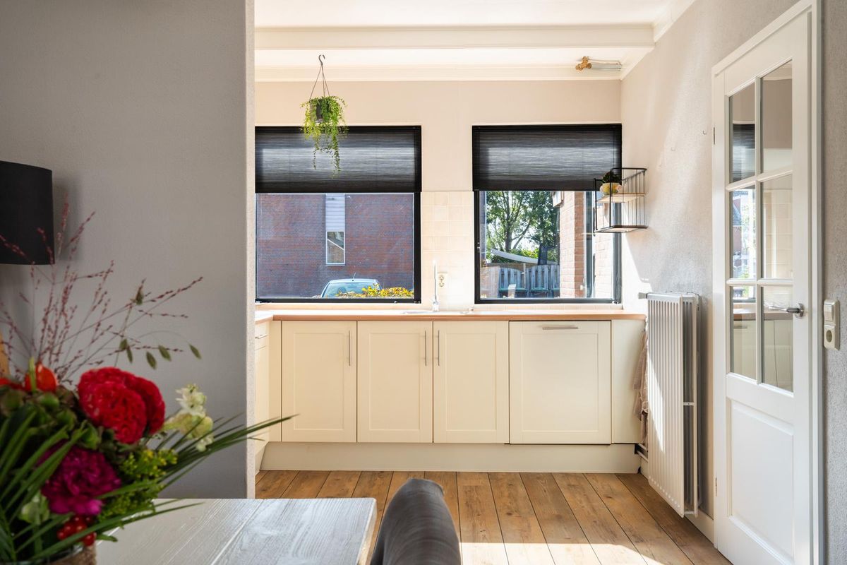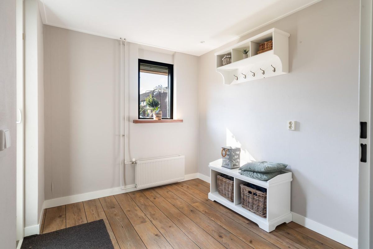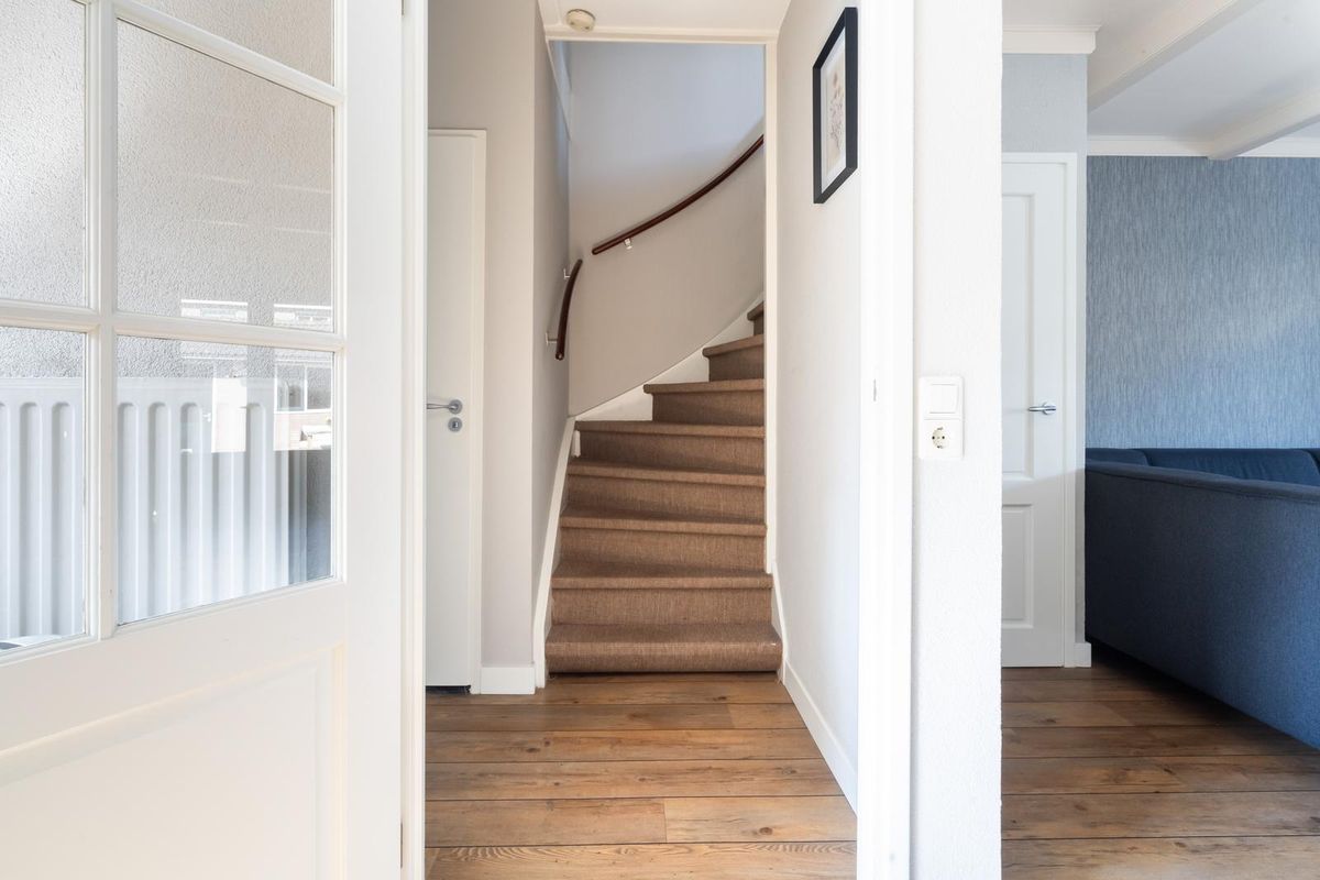 Op de begane grond begint het huis met een ruime entree met bergkast en geeft doorgang naar de hal met trapopgang en toiletruimte. In de ruime entree is plek genoeg voor jassen, schoenen en bijvoorbeeld een voorraadkast – praktisch én overzichtelijk. De woonkamer met trapkast voelt sfeervol en ruimtelijk aan, mede door het balkenplafond, de openslaande deuren naar de tuin en het zijraam dat zorgt voor veel natuurlijk licht. Zodra je de openslaande deuren openzet, loopt de woonkamer moeiteloos over in de tuin – alsof je binnen en buiten met elkaar verbindt.