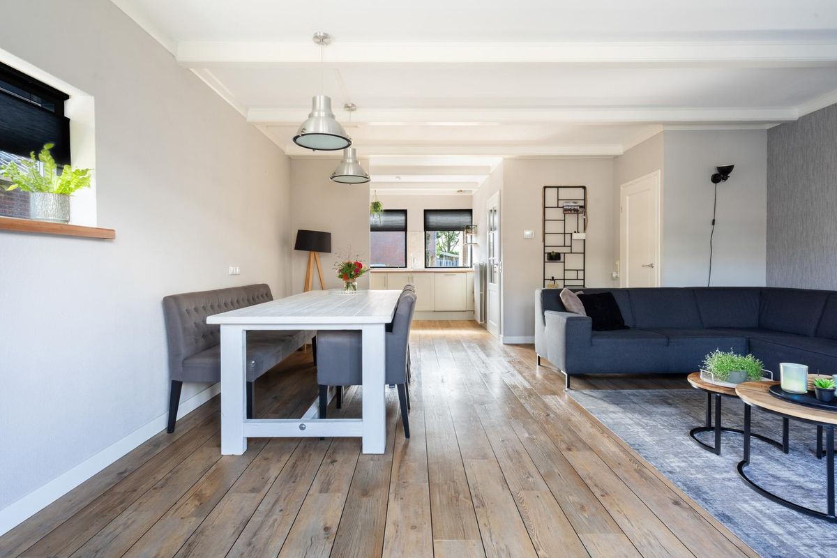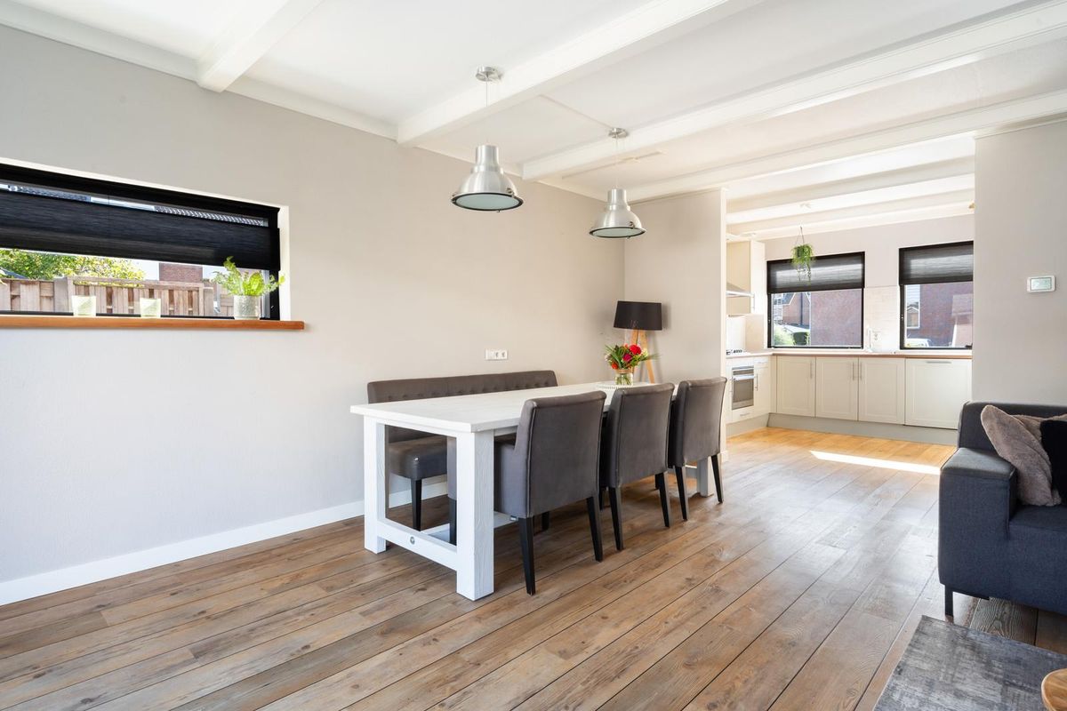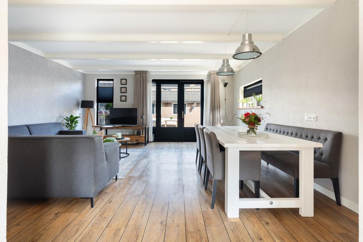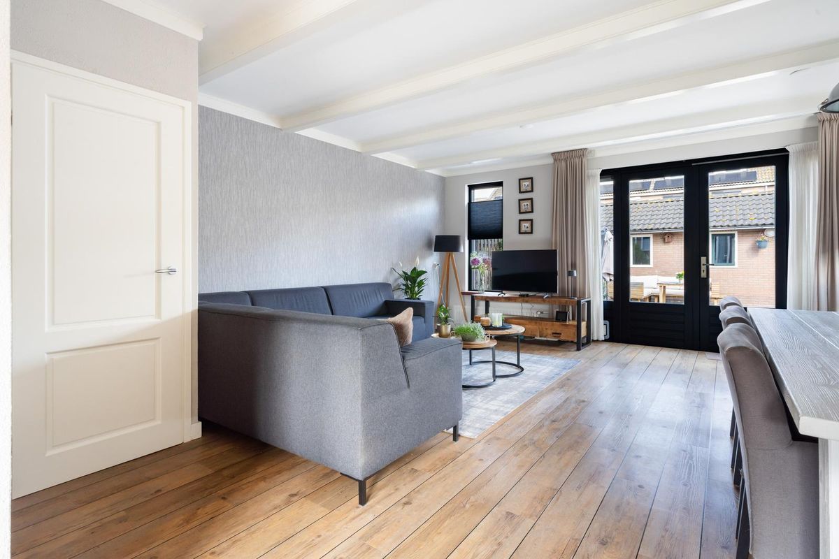 - Woonkamer met openslaande deuren, balkenplafond en zijraam;