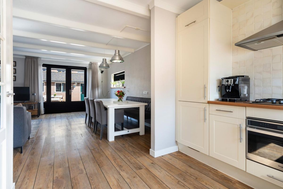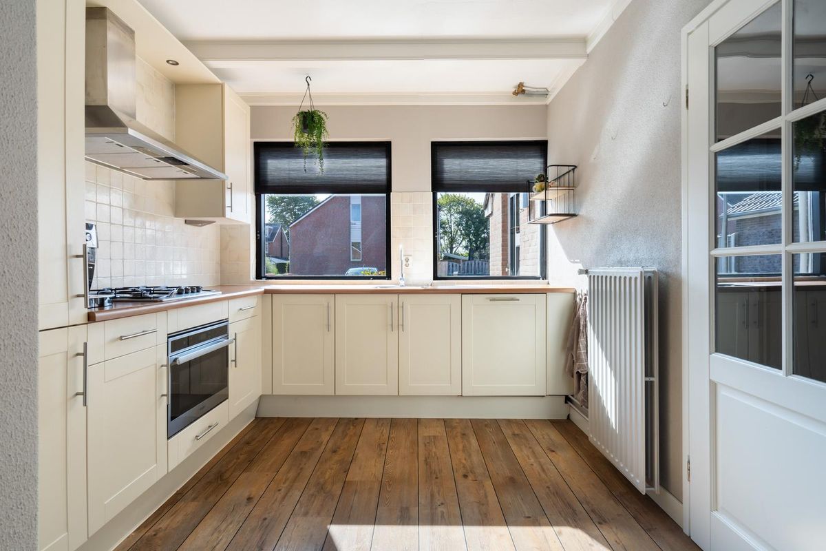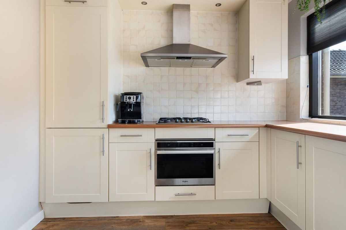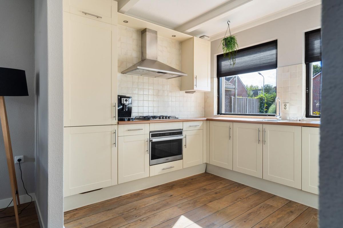 De keuken in hoekopstelling is aan de voorzijde van de woning gelegen. De keuken is netjes afgewerkt en voorzien van een gaskookplaat, afzuigkap, vaatwasser, koel-/vriescombinatie en combi-oven.