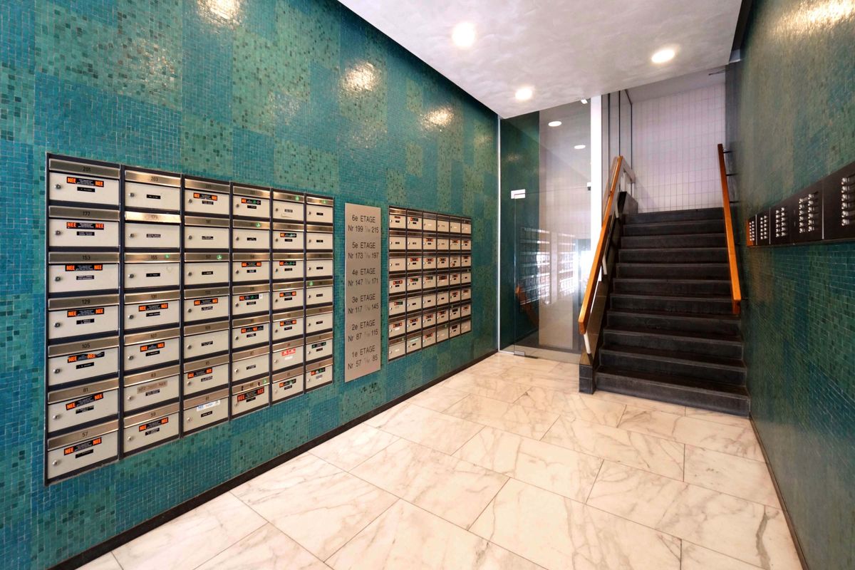 Entrance complex on the ground floor with access to the elevator, the staircase, and the communal bicycle storage.