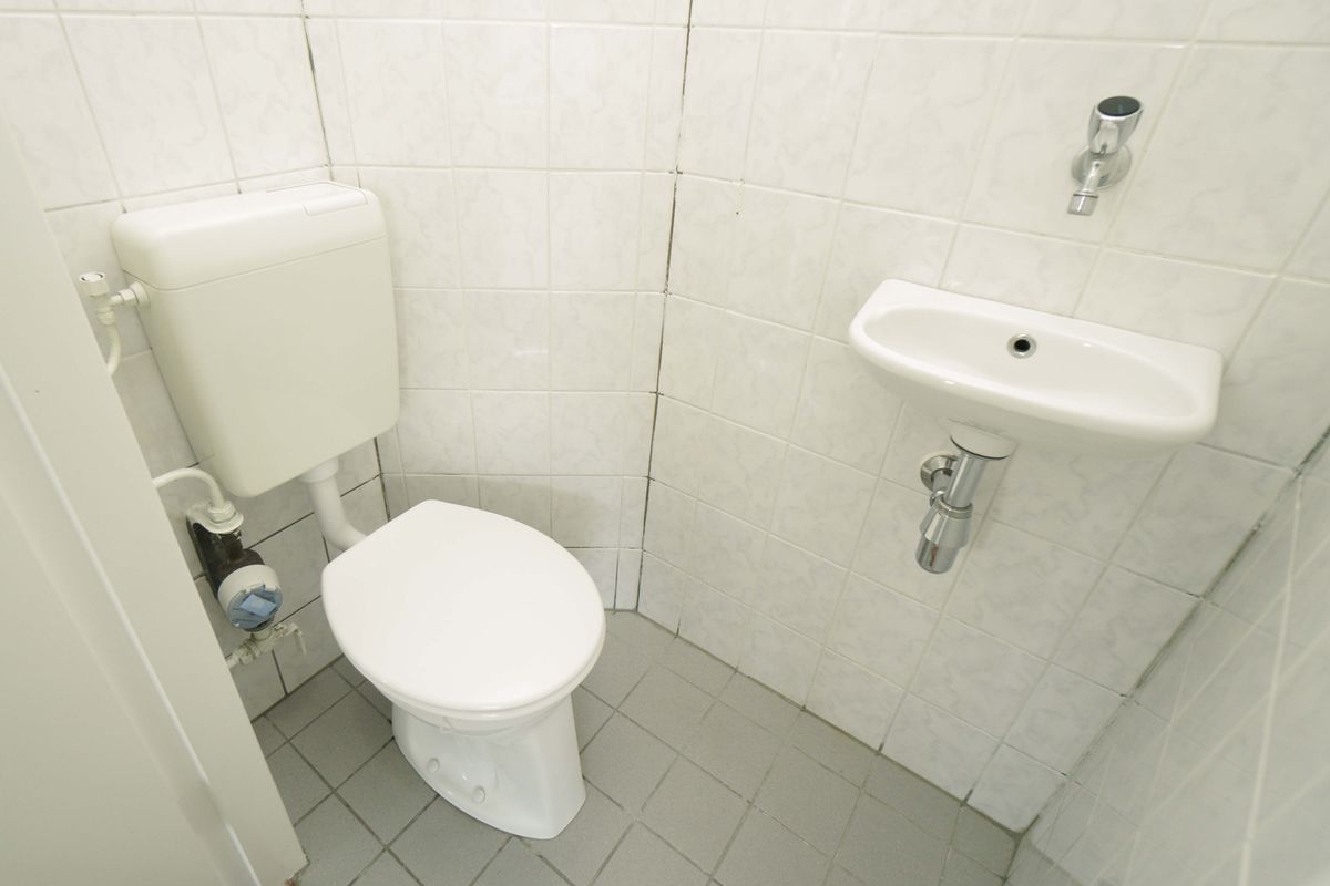 From the hallway, the toilet with a small sink is accessible. There is also a washing machine connection available in a small storage room accessible from the hallway.