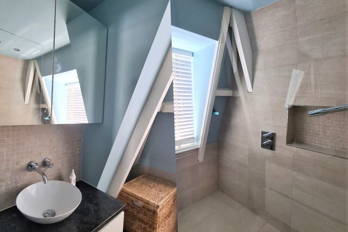 The landing on the second floor can be entered via the fixed staircase, which provides access to both bedrooms and the luxurious bathroom. This is equipped with beautiful tiling, a sink with storage space, a mirror cabinet and a beautiful rain shower. The master bedroom has a balcony with an entrance via the spiral staircase to the roof terrace above. On this roof terrace it is possible to enjoy the beautiful weather and the fantastic view.