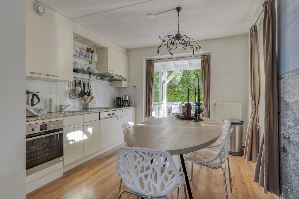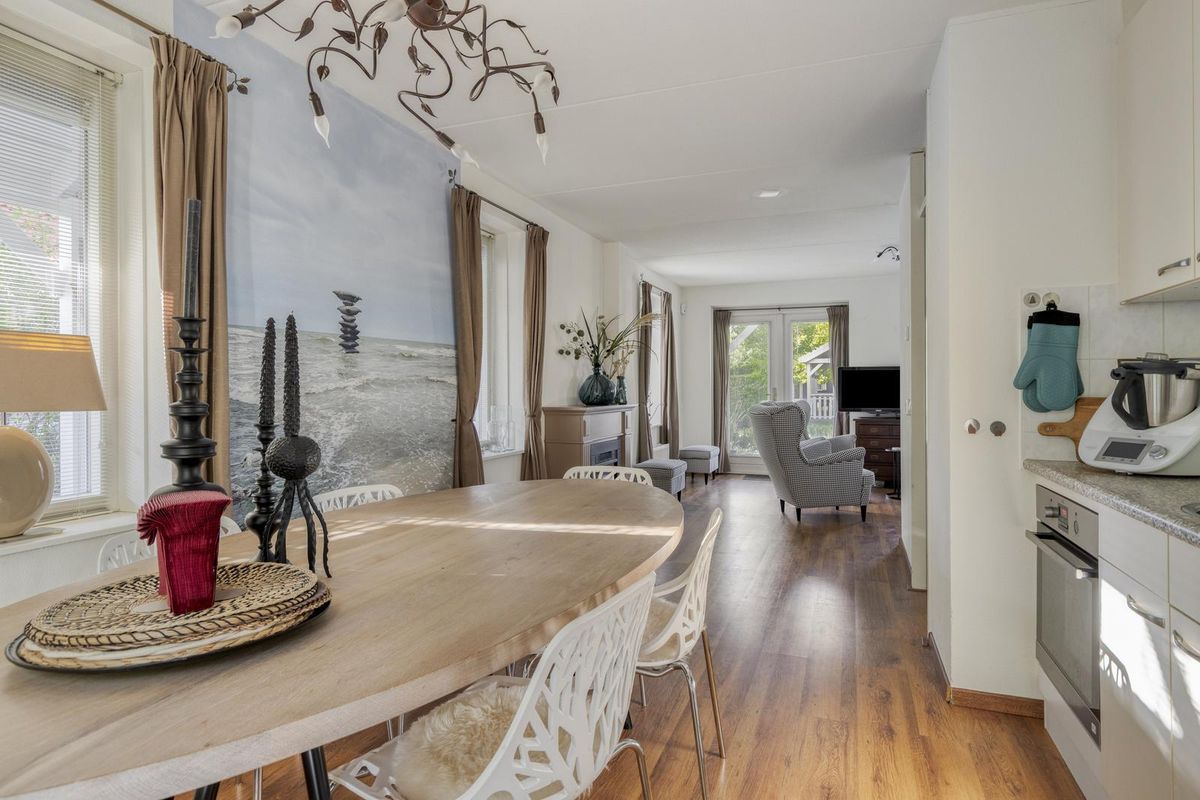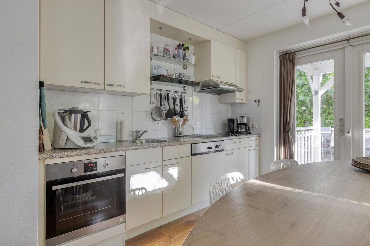 Het woongedeelte bestaat uit een lichte woonkamer aan de voorzijde met radiatoren, tv-aansluiting en openslaande deuren naar de veranda. Aansluitend vind je de open keuken met rechte opstelling, voorzien van diverse apparatuur en kastruimte. Via de openslaande tuindeuren stap je direct de beschutte achtertuin in met terras, veel privacy en een vrije achterom.