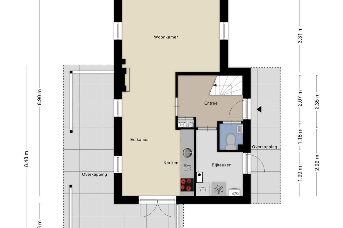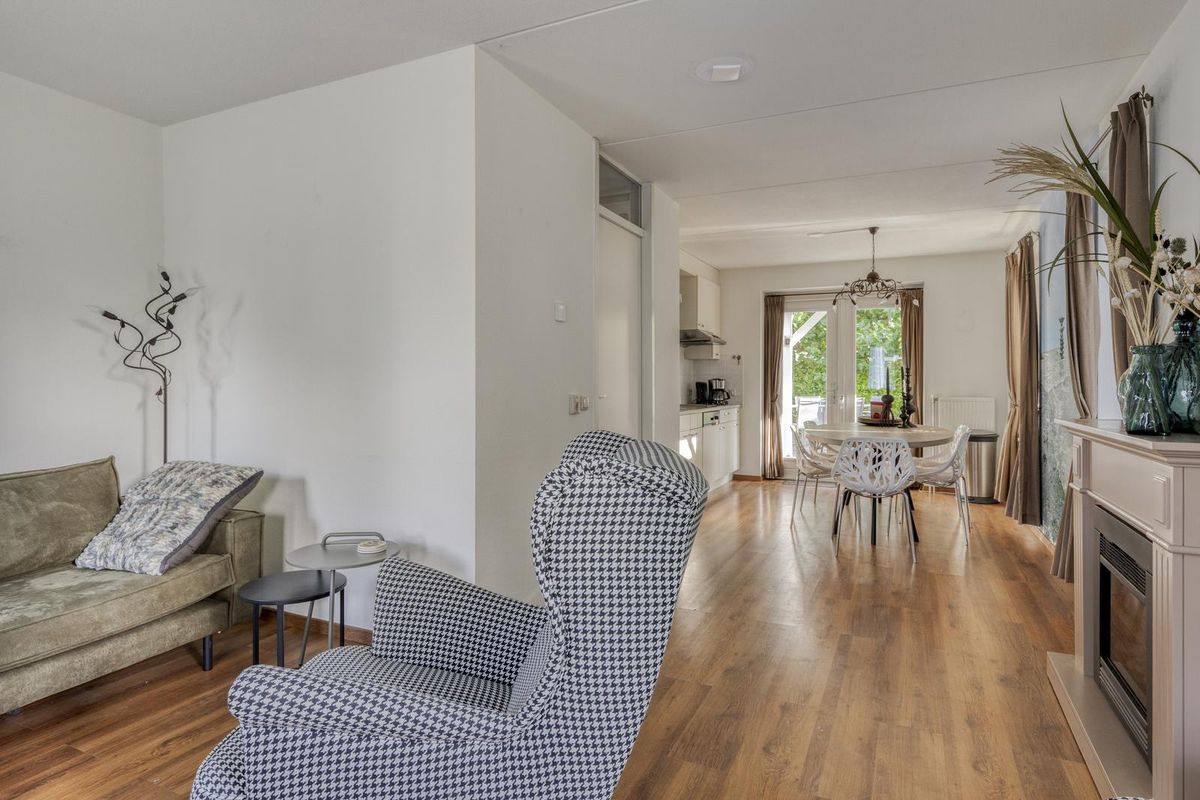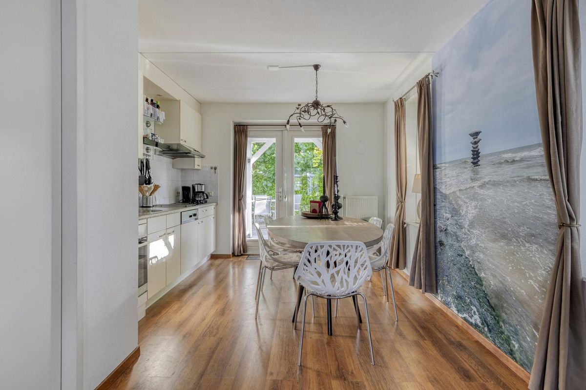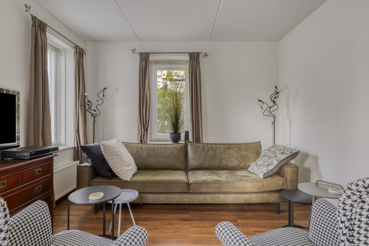 Het woongedeelte bestaat uit een lichte woonkamer aan de voorzijde met radiatoren, tv-aansluiting en openslaande deuren naar de veranda. Aansluitend vind je de open keuken met rechte opstelling, voorzien van diverse apparatuur en kastruimte. Via de openslaande tuindeuren stap je direct de beschutte achtertuin in met terras, veel privacy en een vrije achterom.