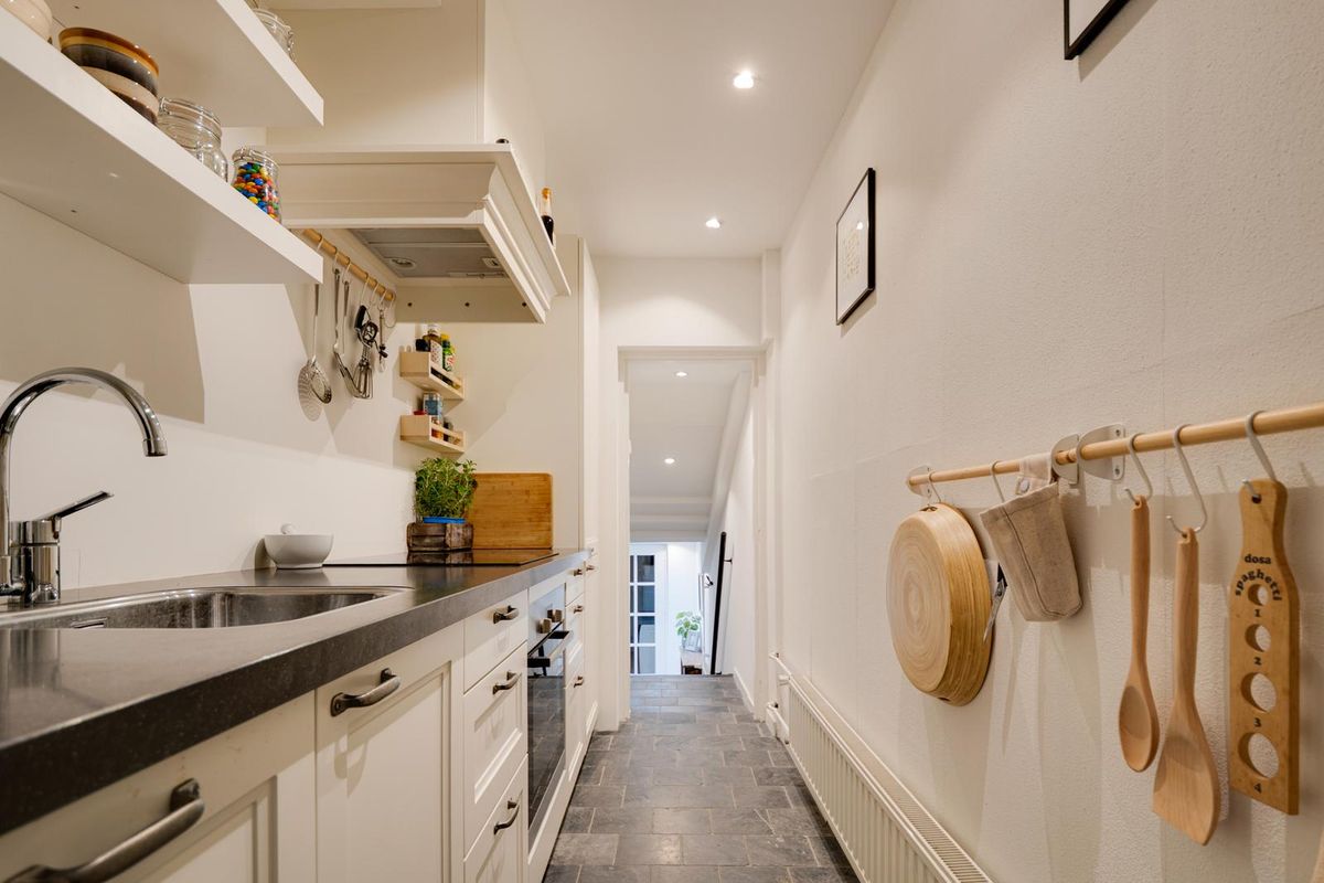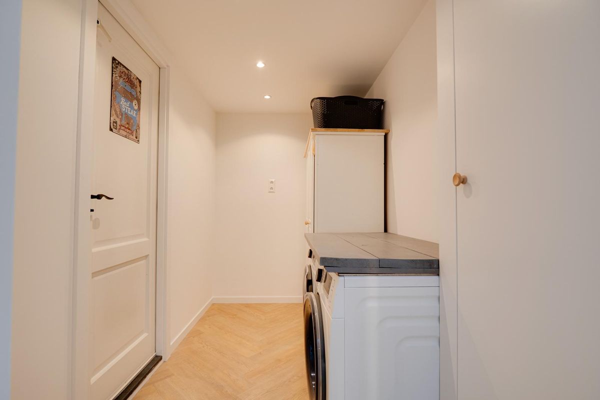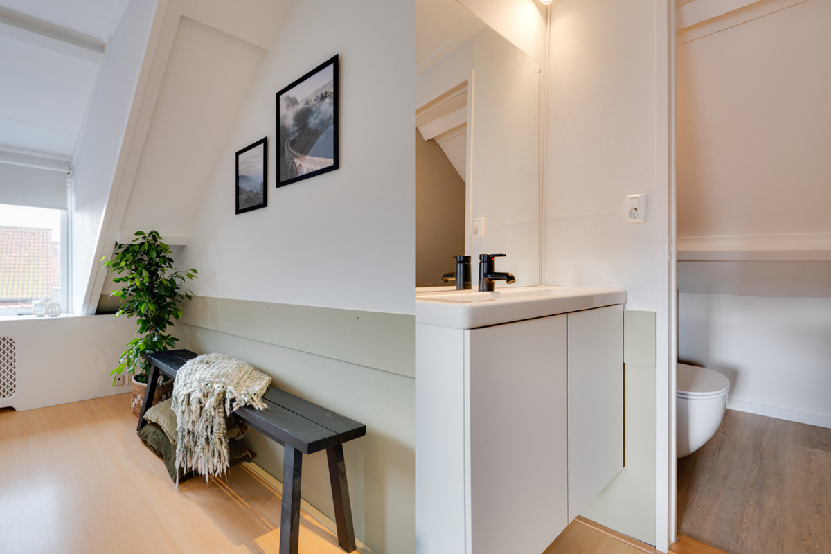 Grenzend aan de woonkamer bevindt zich de keuken, voorzien van een inductiekookplaat, oven, koelkast, kleine vaatwasser en zes diepe lades. Vanuit de keuken loopt u door naar de vernieuwde badkamer. Deze is uitgebreid met een aanbouw en beschikt over een ruim wastafelmeubel met twee waskommen, een inloopdouche met easy drain, zwarte kranen en een toilet.