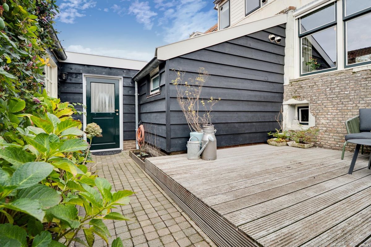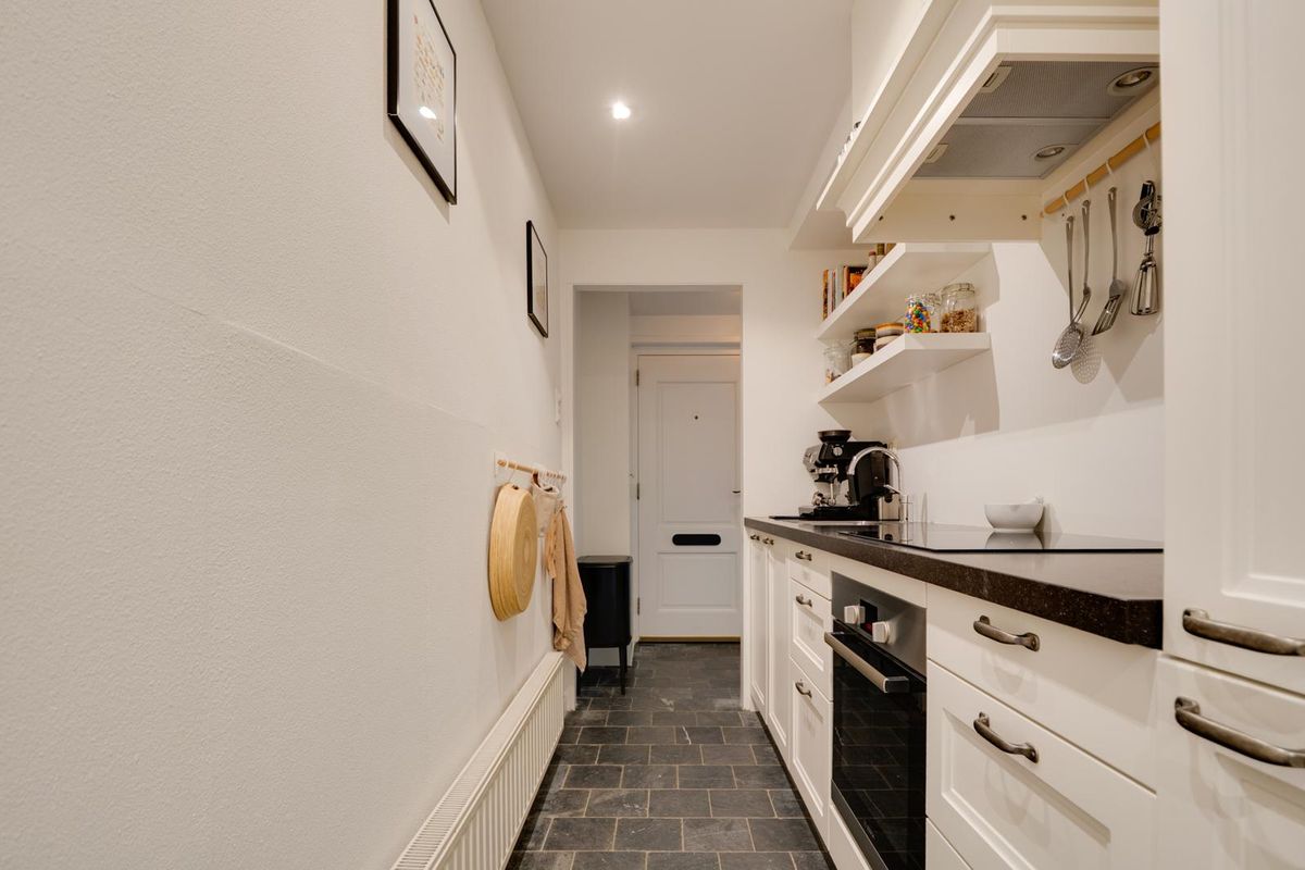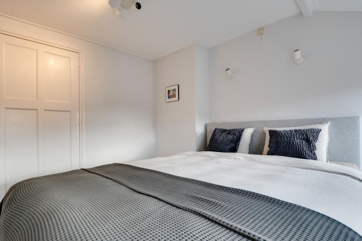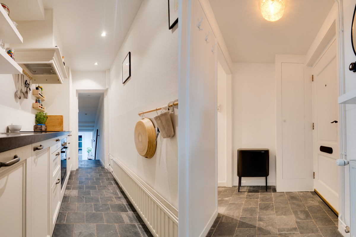 Grenzend aan de woonkamer bevindt zich de keuken, voorzien van een inductiekookplaat, oven, koelkast, kleine vaatwasser en zes diepe lades. Vanuit de keuken loopt u door naar de vernieuwde badkamer. Deze is uitgebreid met een aanbouw en beschikt over een ruim wastafelmeubel met twee waskommen, een inloopdouche met easy drain, zwarte kranen en een toilet.