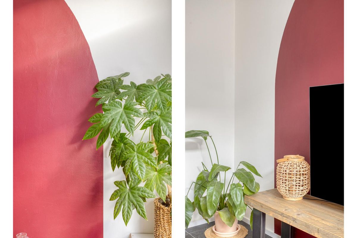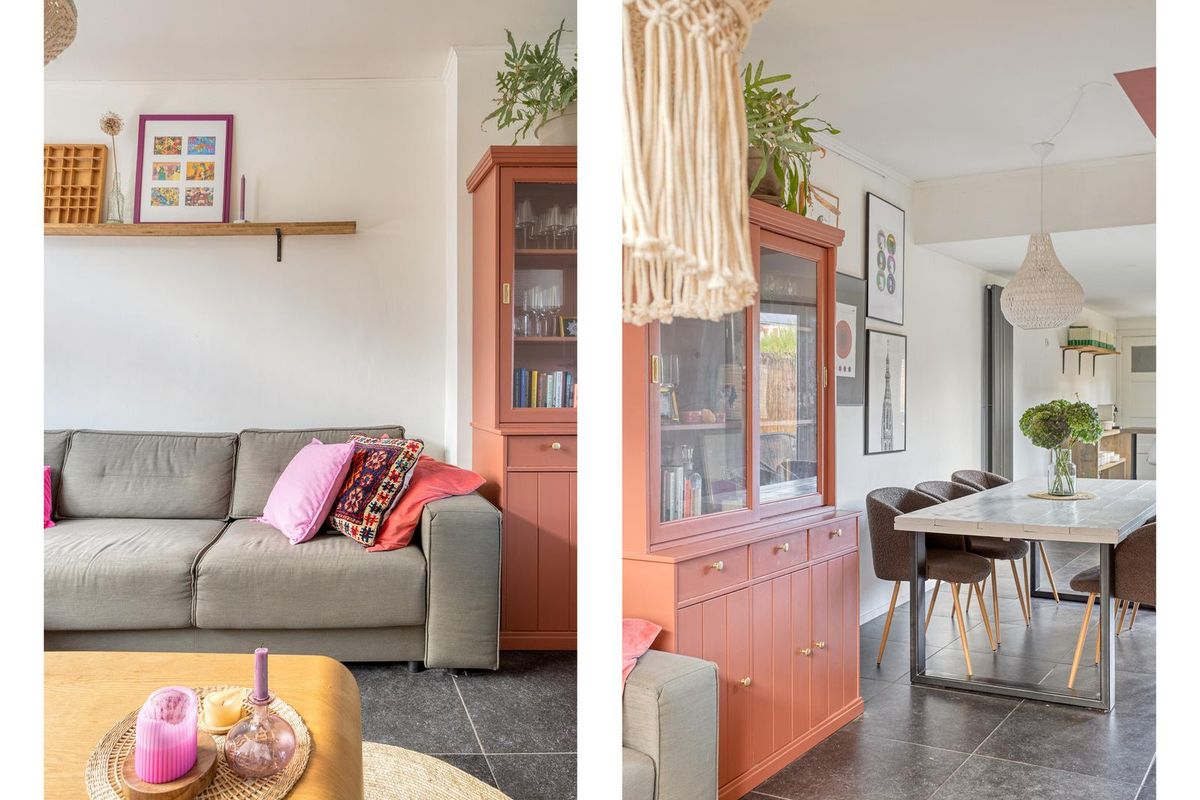 De woonkamer is ruim, licht en sfeervol. Dankzij de strak gestucte wanden en het open karakter voelt de ruimte modern en gezellig aan. De eethoek sluit naadloos aan op de zithoek, wat zorgt voor een fijne verbinding. En met openslaande deuren naar de tuin haal je op mooie dagen het buitenleven naar binnen.