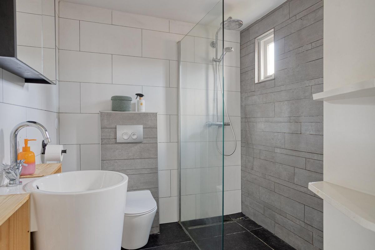 De badkamer op de begane grond is modern en licht, met een inloopdouche, toilet en een stijlvol wastafelmeubel. Op de eerste verdieping wachten twee grote, nette slaapkamers op je, beide met veel natuurlijk licht en een verzorgde afwerking. Ideaal voor een gezin, thuiswerkers of logés.