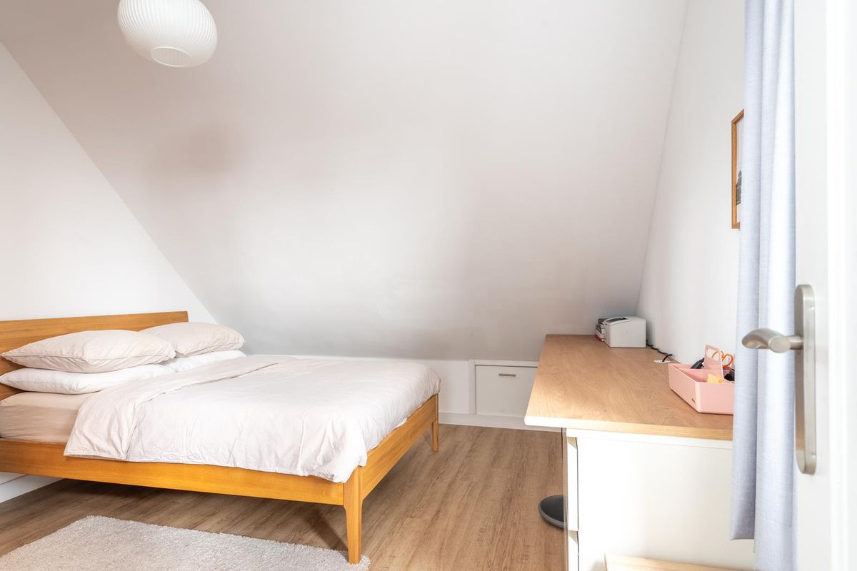 De ruime slaapkamer is netjes afgewerkt en voorzien van een pvc-vloer, stucwanden, stucplafond en vast bureaublad.