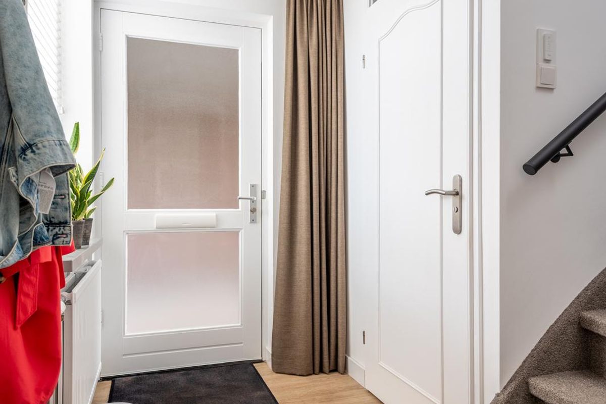 Ruime, lichte entree met toegang tot de woonkamer, het vernieuwde toilet en de trap naar de tweede verdieping.