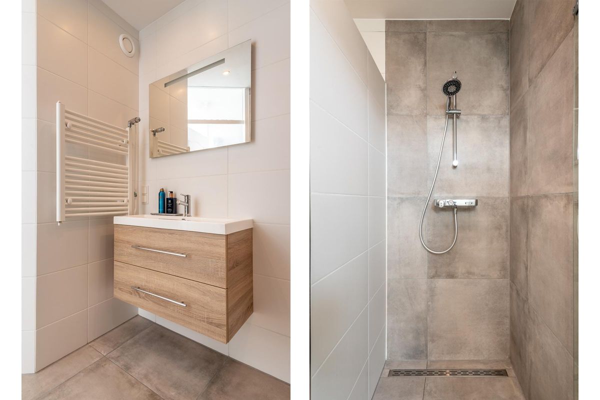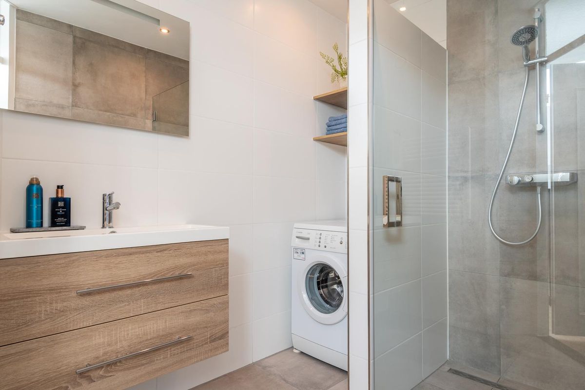De moderne badkamer heeft een inloopdouche, wastafelmeubel en je vindt hier de aansluiting van de wasapparatuur.