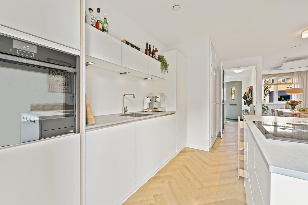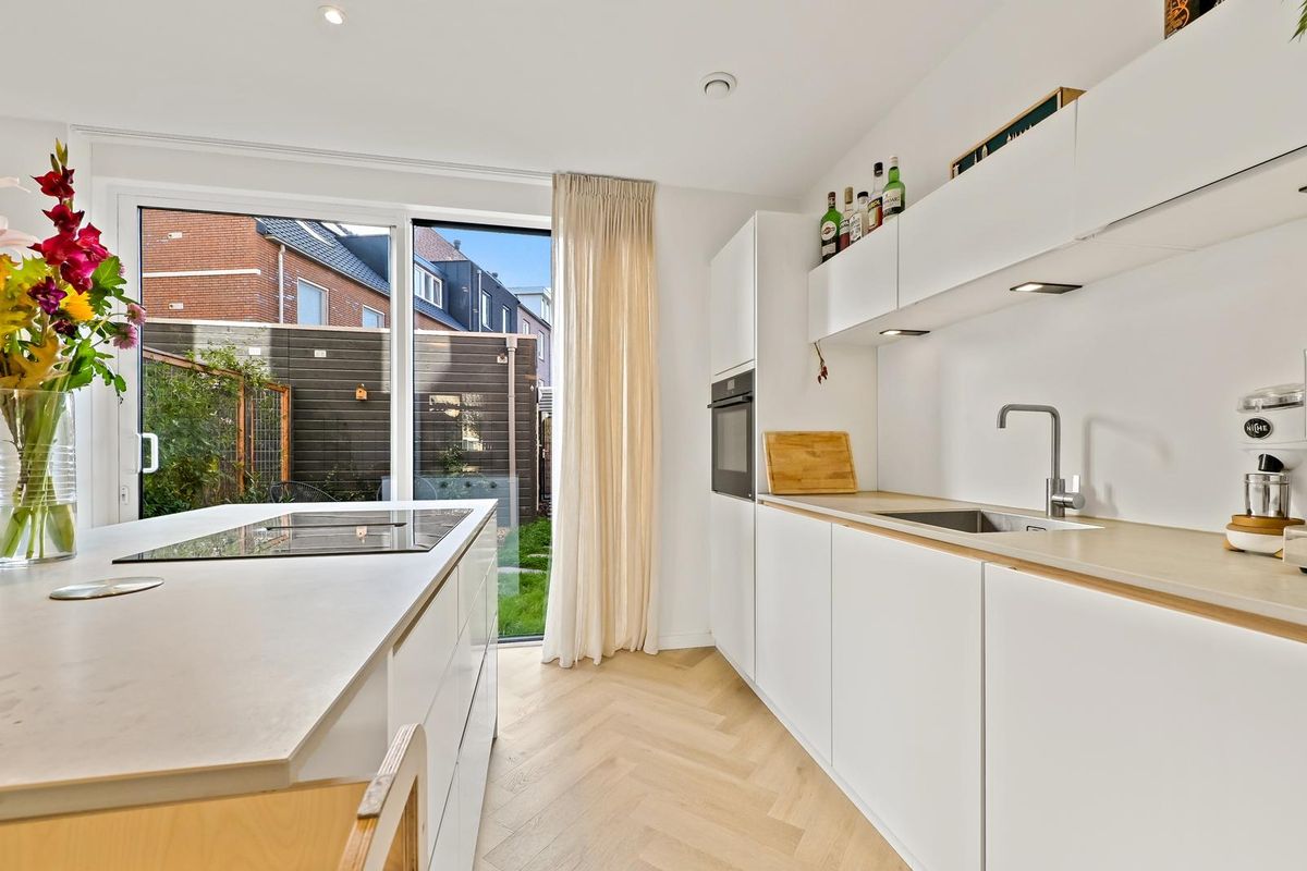 Entree, hal met meterkast en toilet voorzien van vrij hangend closet en fonteintje, eetkamer met luxe open keuken voorzien van apparatuur van Siemens StudioLine met o.a. stoomoven en inductie kookplaat met geïntegreerde afzuigkap in het kookeiland. Schuifdeur naar fraai aangelegde tuin welke is voorzien van een watertappunt en elektra, ruime berging voorzien van groen sedum dak en afgesloten achterom. Privé parkeerplaats voorzien van laadpaal.