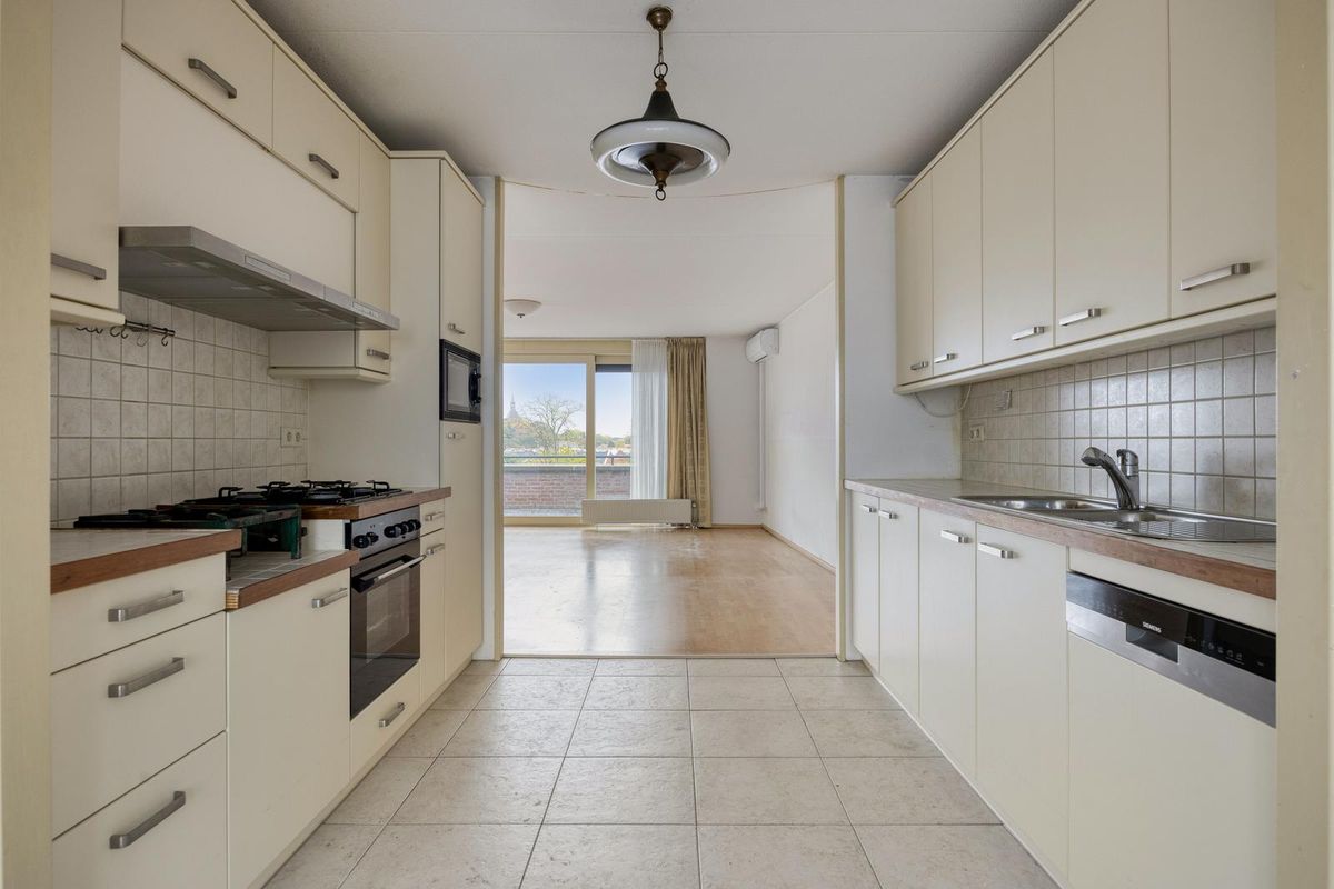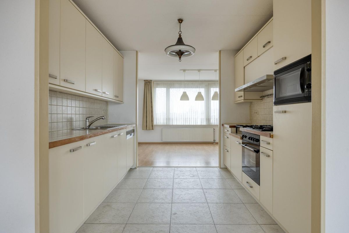 De woonkamer vormt het hart van het penthouse en kenmerkt zich door de royale oppervlakte en de hoeveelheid natuurlijk licht die binnenvalt via de grote raampartijen en de schuifpui naar het dakterras. Dankzij de gunstige ligging geniet je hier de hele dag van zonlicht en een vrij uitzicht over Tilburg. De ruimte biedt volop mogelijkheden voor een comfortabele zithoek én een aparte lees- of werkhoek. De neutrale afwerking maakt het eenvoudig om er je eigen stijl aan te geven, van modern tot warm en huiselijk. De woonkamer staat in open verbinding met de keuken en de eethoek, waardoor een prettig, doorlopend geheel ontstaat. De keuken is uitgevoerd in een lichte kleurstelling met houten werkblad en voorzien van diverse inbouwapparatuur, waaronder een gaskookplaat, afzuigkap, oven, magnetron en vaatwasser. In de aangrenzende eethoek is ruimte voor een grote eettafel, perfect om met familie of vrienden te dineren.