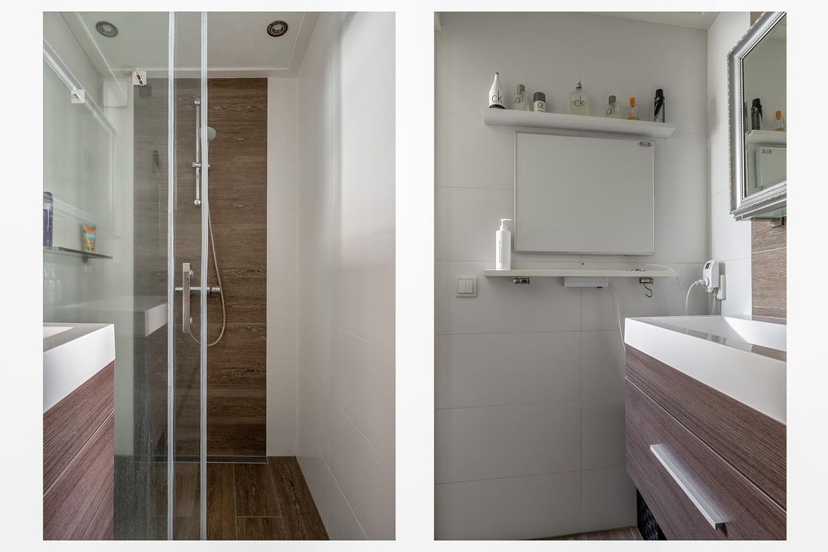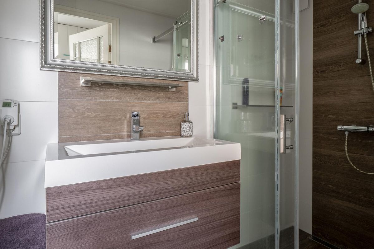 - Moderne badkamer met brede wastafel en inloopdouche.