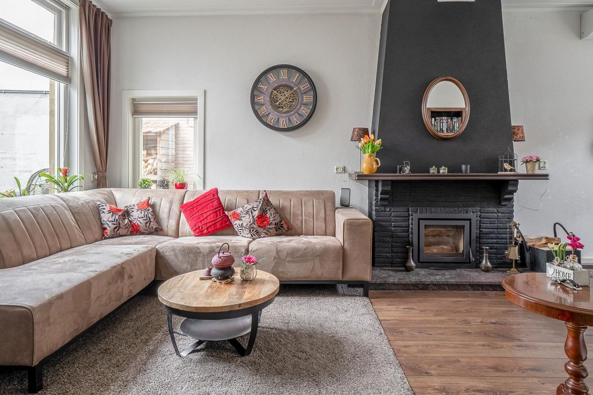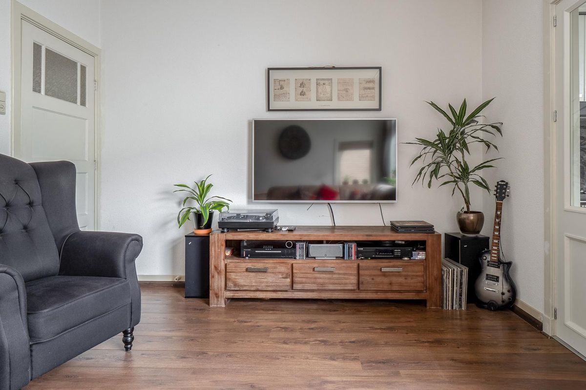 - Lichte tuingerichte woonkamer, met zijgevel venster, schouw en voorkamer voor de eettafel.