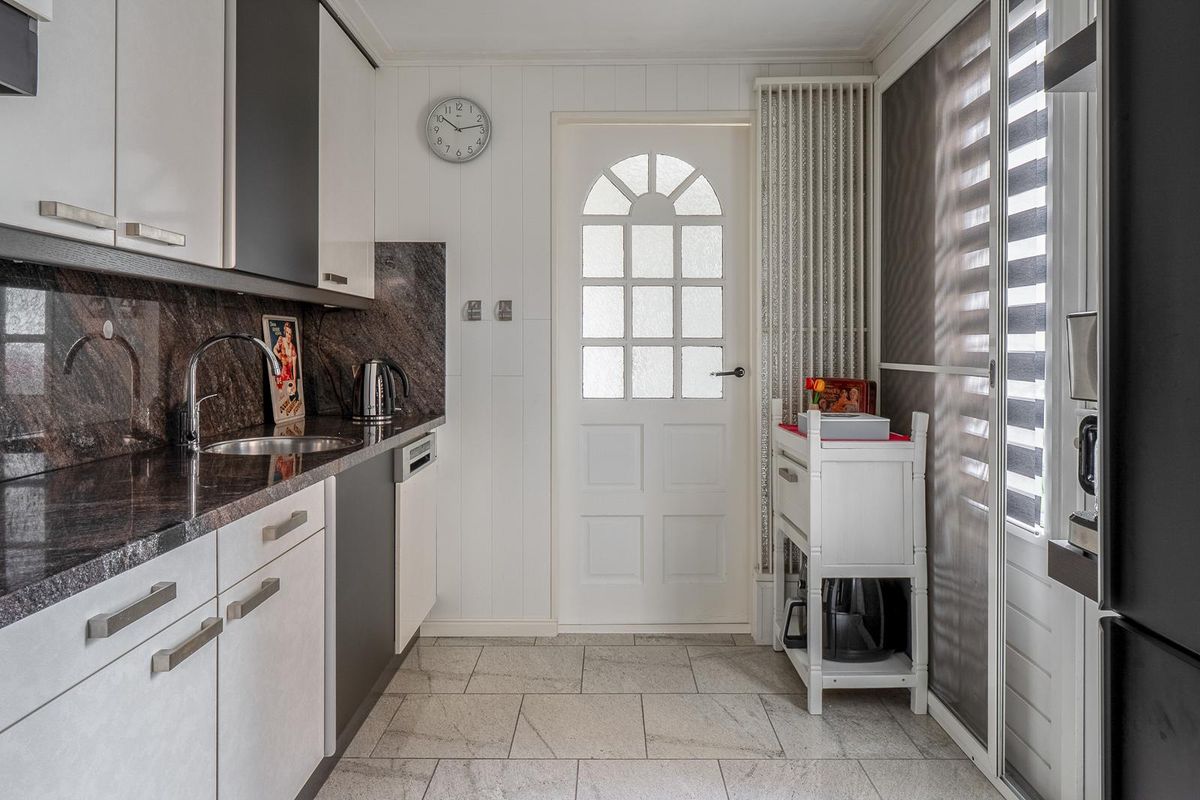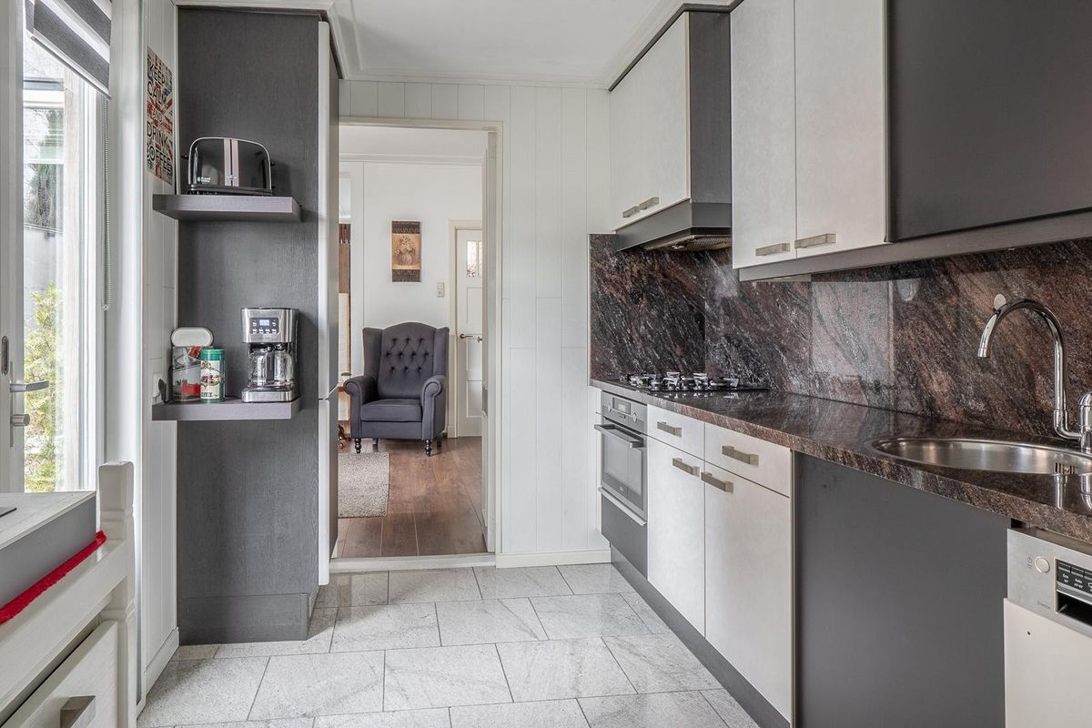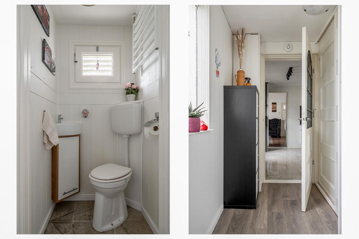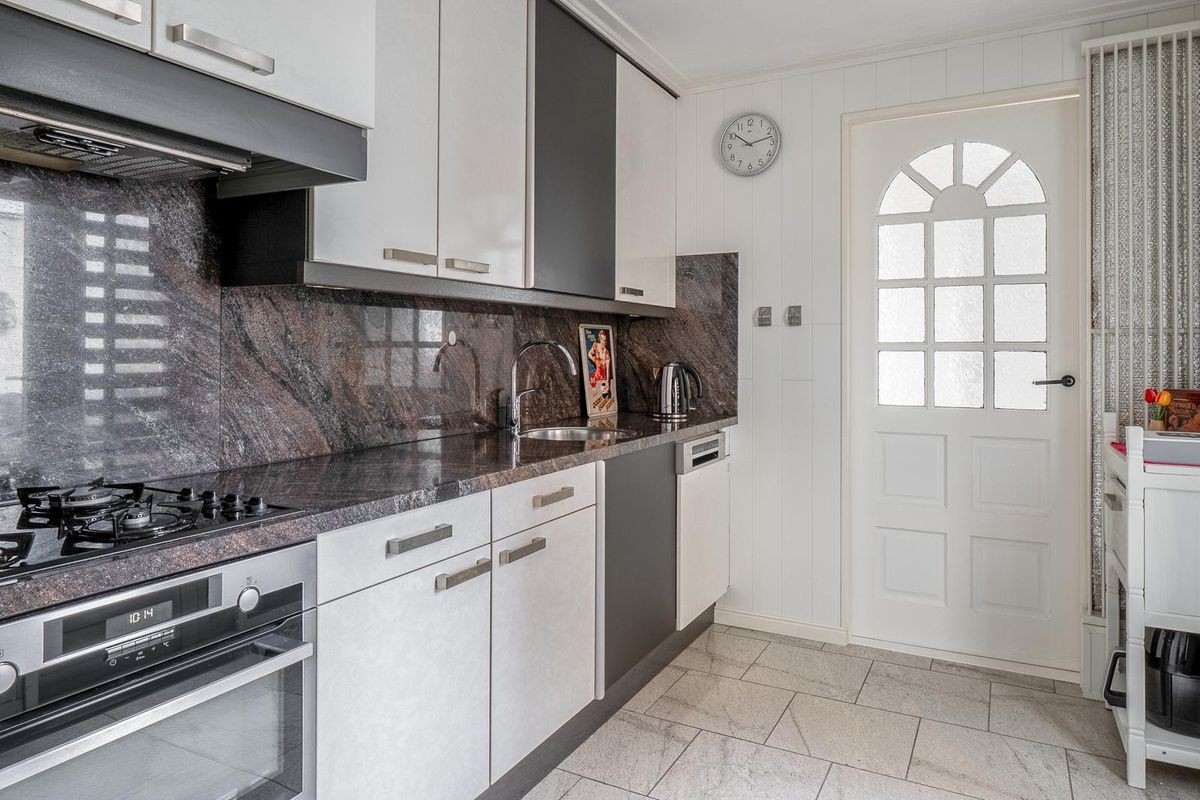 Achter de keuken ligt de bijkeuken met cv en witgoed opstelplaats, keurig in een kast verwerkt. Vanuit de bijkeuken zijn de moderne badkamer met wastafelmeubel en riante inloopdouche en het separate toilet te bereiken.