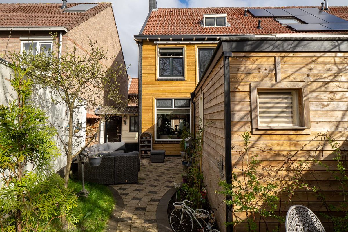- Zijgevel en achtergevel voorzien van een fraaie en isolerende houten wand.