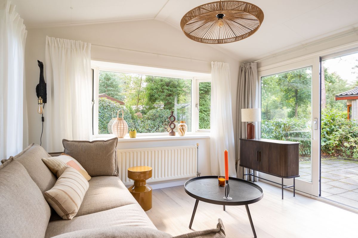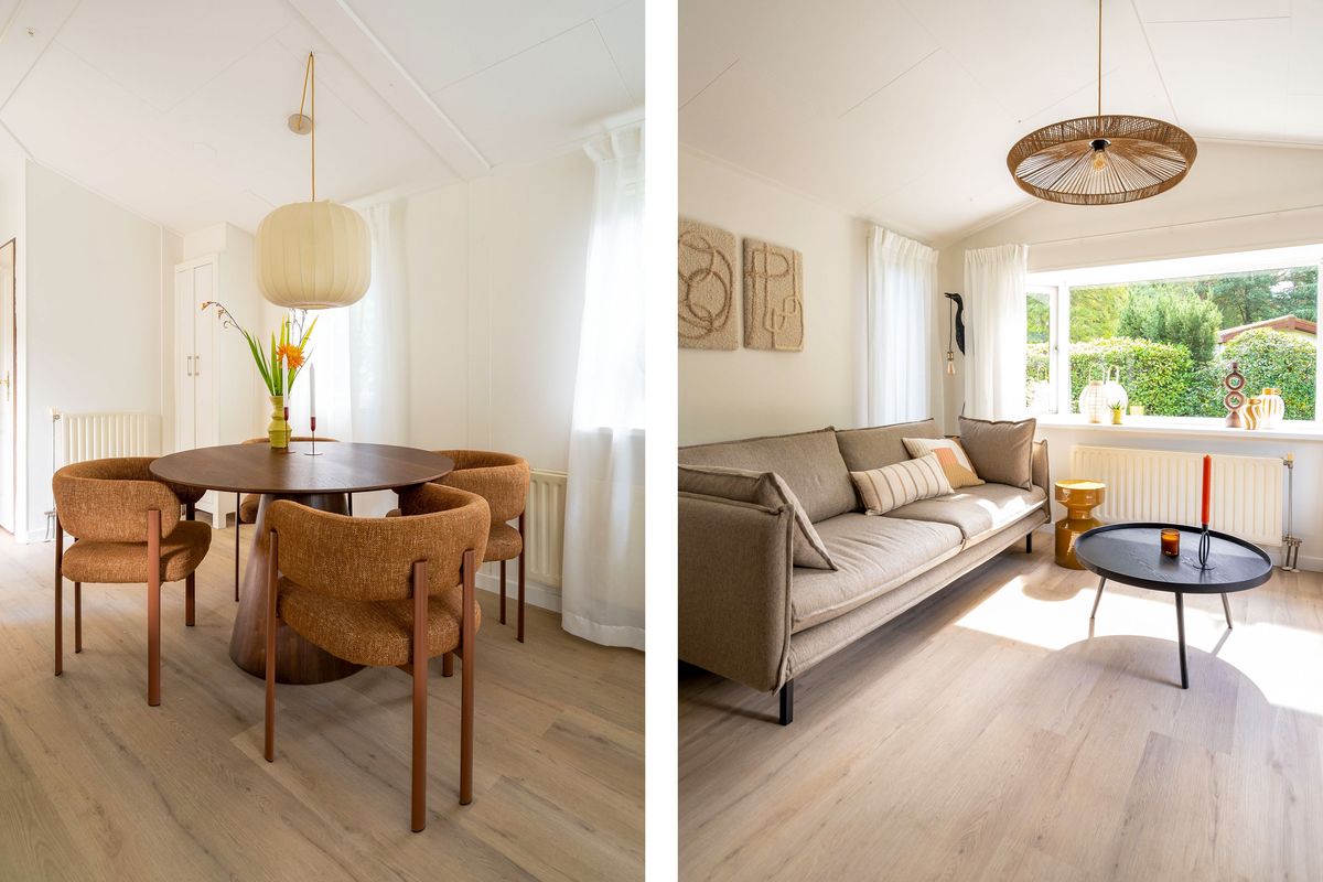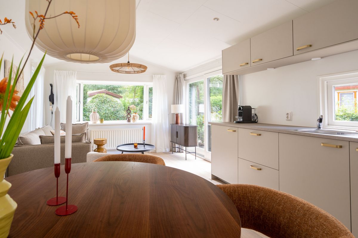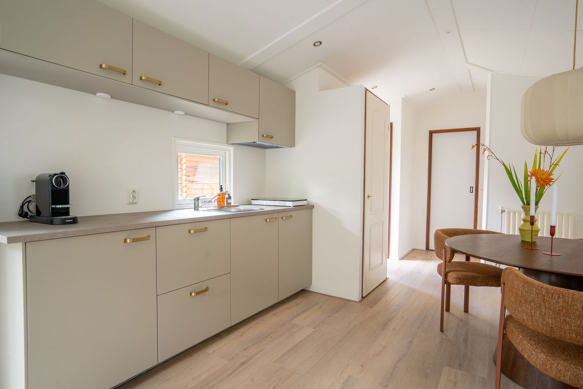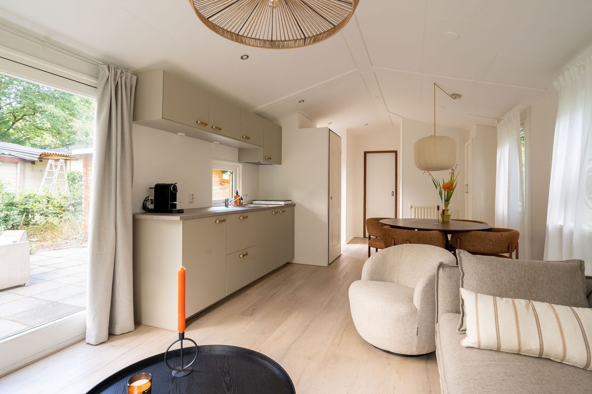 Via de entree komt u in de ruime, lichte en moderne woonkamer met schuifpui naar het zonneterras met daarbij een geheel nieuw en modern keukenblok. De woonkamer is extra groot waardoor u heerlijk veel leefruimte heeft. Er is één slaapkamer met een tweepersoonsbed, een vaste kast met schuifdeuren en als groot voordeel: er is een aansluiting voor de wasmachine in het chalet en ook in het tuinhuisje!