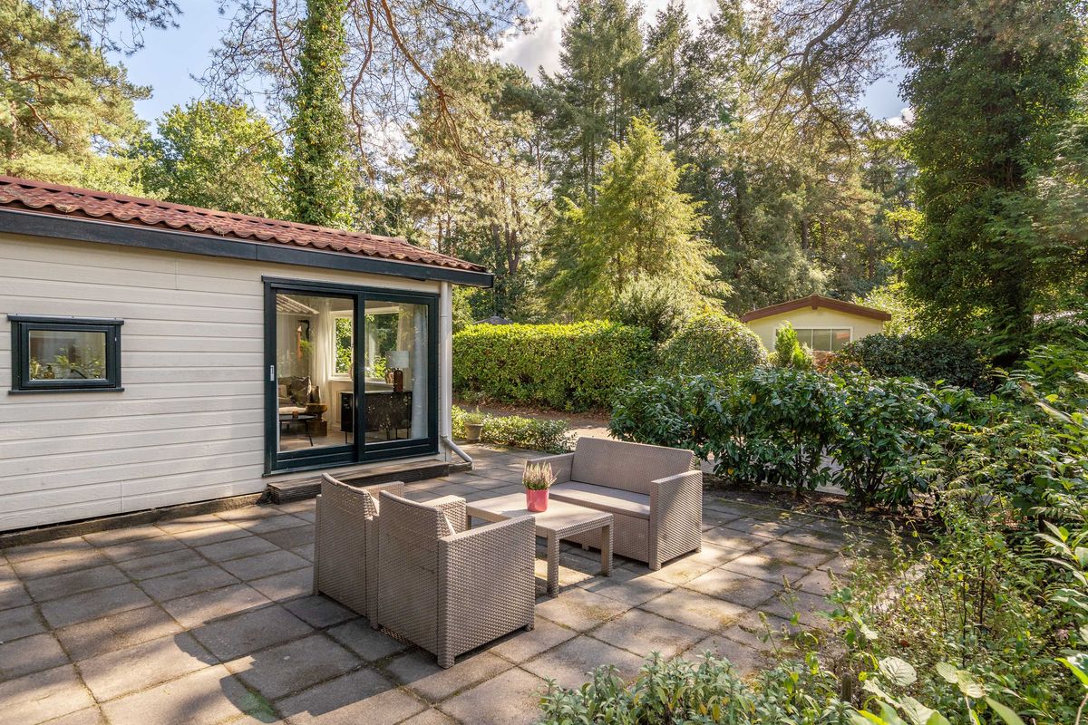 Het zonnige terras ligt ideaal op het westen en biedt veel privacy door de natuurlijke beschutting van groen rondom. Daarnaast is er een houten tuinhuisje (ca. 3 x 2 m) aanwezig voor extra bergruimte.