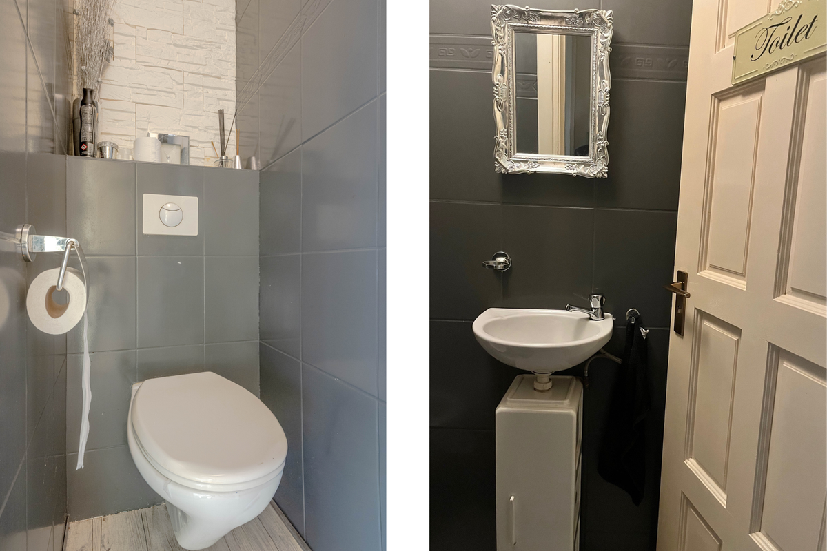 * Toiletruimte voorzien van wandtoilet, fonteintje en betegeling.
