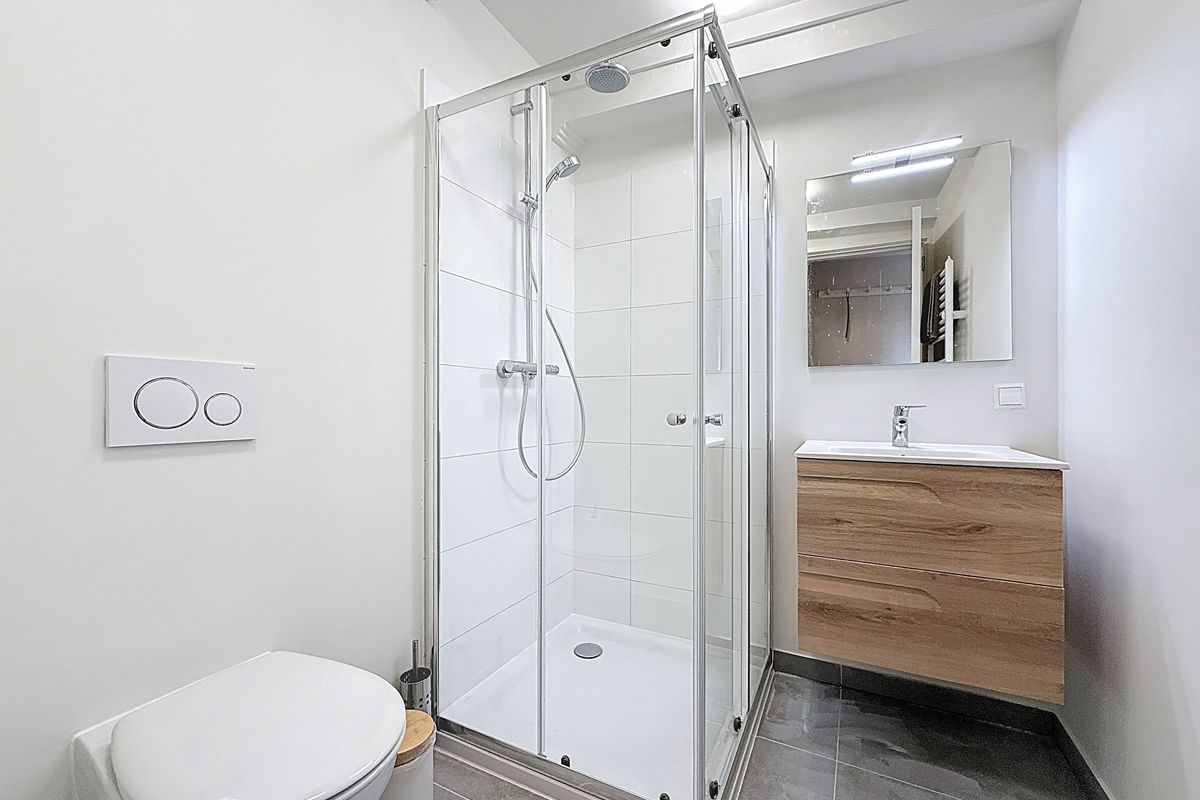 The modern bathroom has also been completely renewed and features a walk-in shower, elegant washbasin cabinet, and toilet. A practical storage closet neatly conceals the washing machine, ready for immediate use.