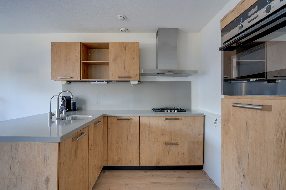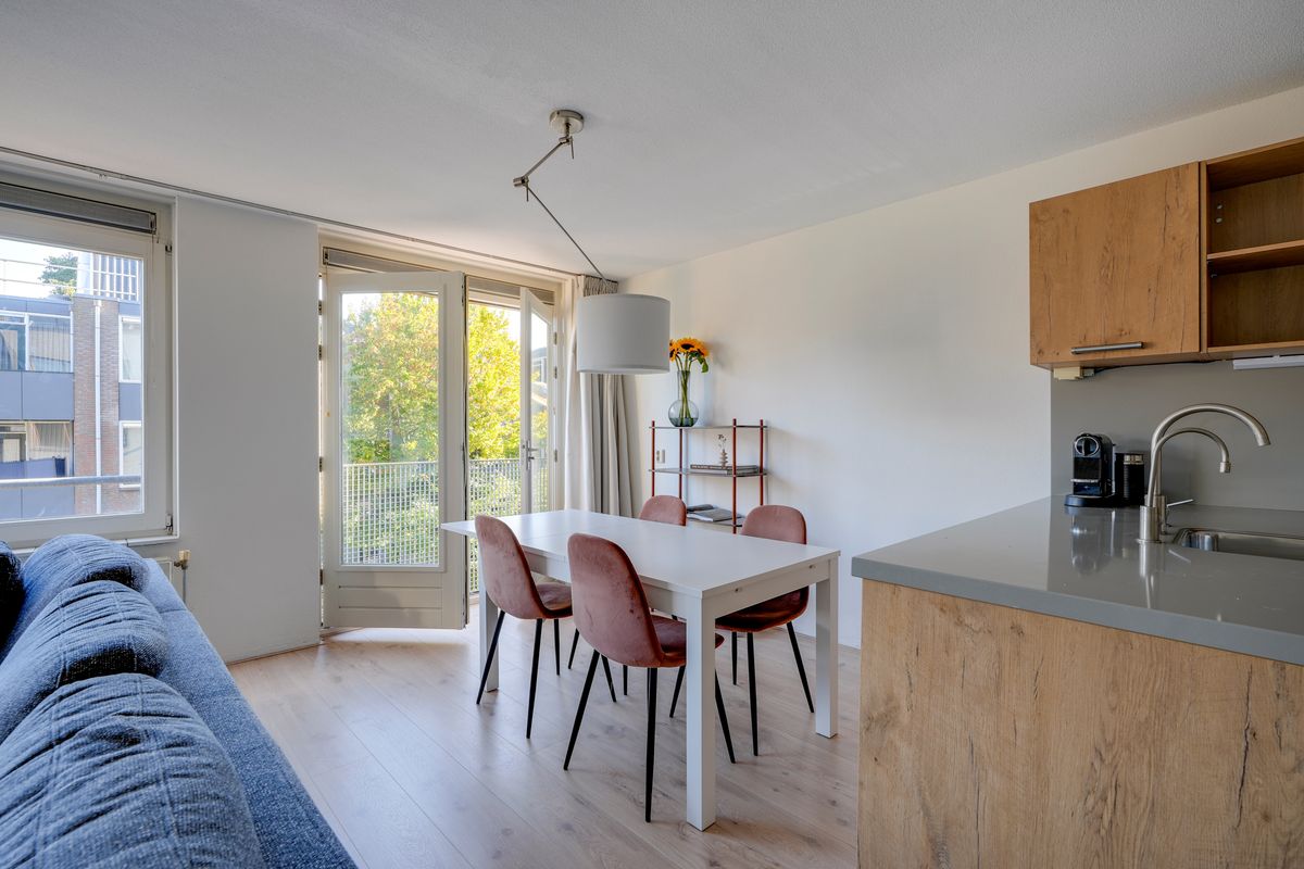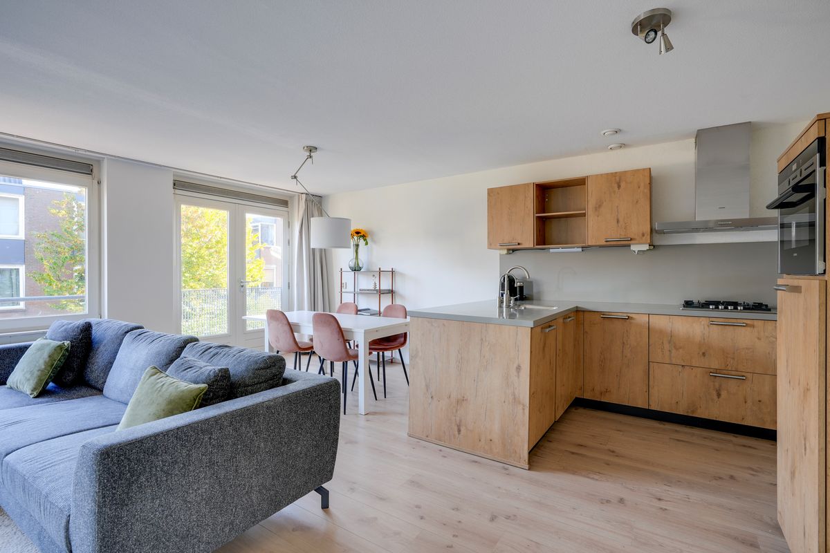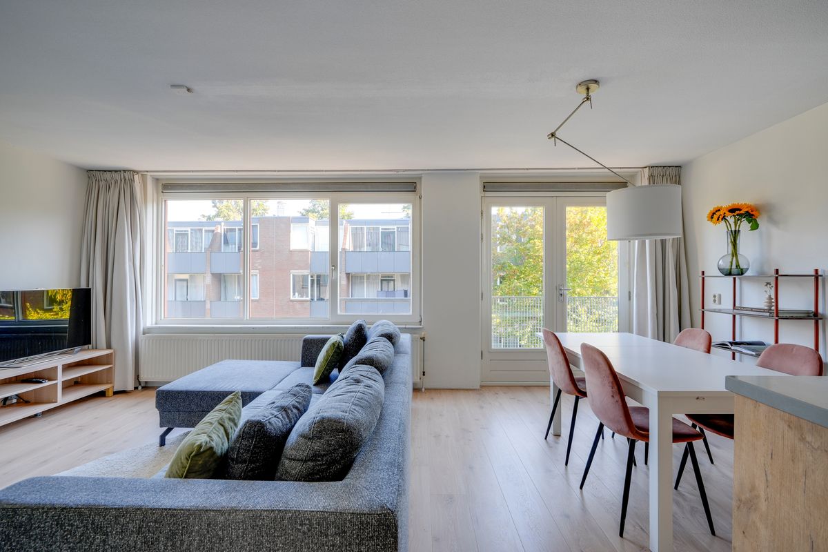 Het appartement bevindt zich op de eerste verdieping van een verzorgd complex uit 1998, toegankelijk via een gezamenlijke entree en trappenhuis. Bij binnenkomst valt de woonkamer op door de grote raampartijen die veel natuurlijk licht binnenlaten en zorgen voor een open en prettige sfeer. De woonkamer is ruim opgezet en biedt genoeg plek voor een comfortabele zithoek en een eethoek. De open keuken grenst direct aan de woonkamer en is praktisch ingericht met diverse inbouwapparatuur van hoge kwaliteit, wat koken en samen eten eenvoudig en aangenaam maakt.