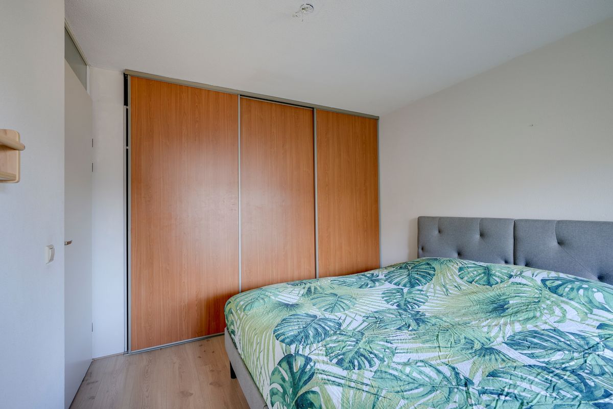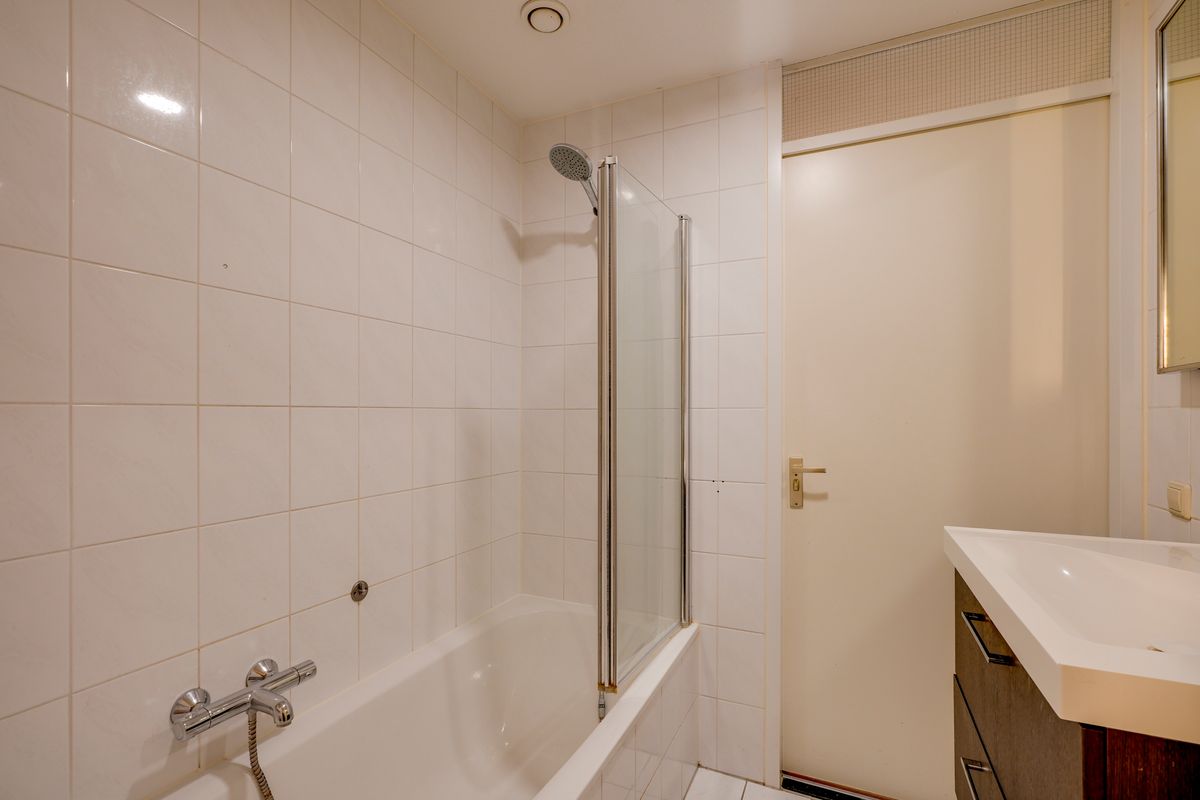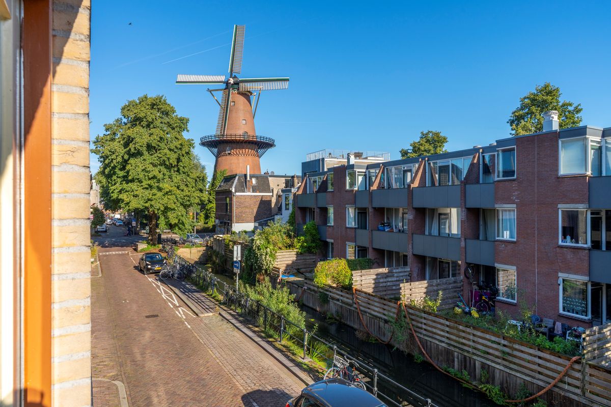 De slaapkamer ligt aan de straatzijde en geeft toegang tot het balkon, vanwaar je geniet van het fraaie uitzicht op de molen. Ingebouwde kasten in de slaapkamer zorgen voor optimale bergruimte en een verzorgde uitstraling. De badkamer is voorzien van een ligbad, radiator en wastafel met meubel. Achter de badkamer is een praktische berging gesitueerd met aansluitingen voor wasmachine en droger en extra opslagmogelijkheden. Bovendien beschikt het appartement over een externe berging op de begane grond, ideaal voor extra opslag.