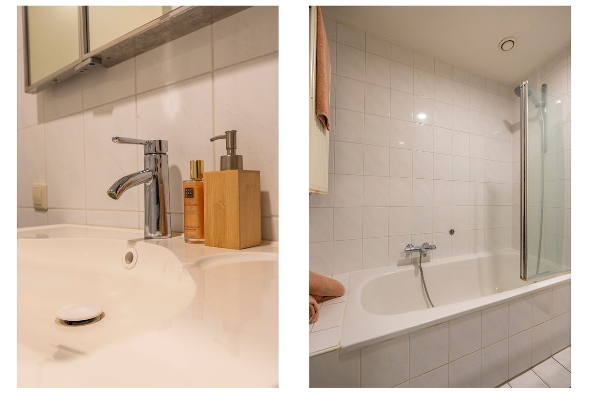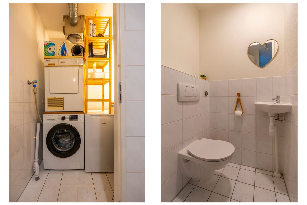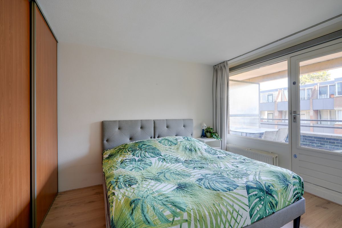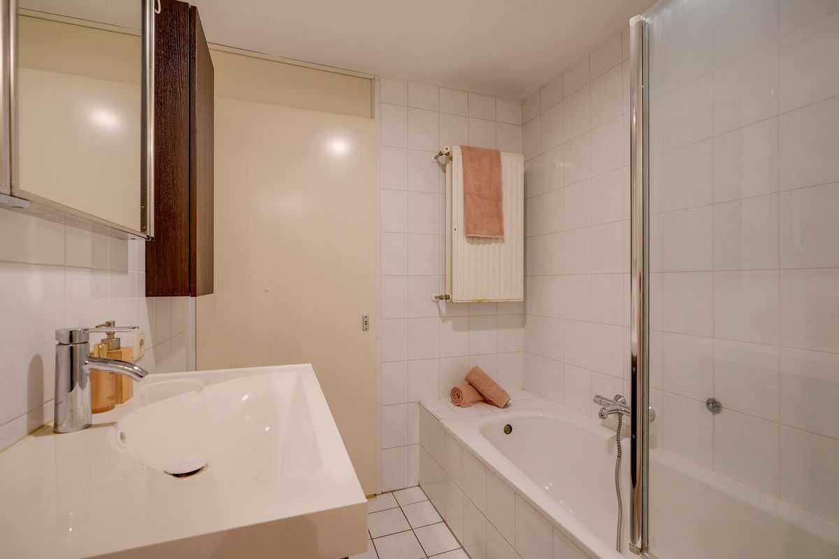 De slaapkamer ligt aan de straatzijde en geeft toegang tot het balkon, vanwaar je geniet van het fraaie uitzicht op de molen. Ingebouwde kasten in de slaapkamer zorgen voor optimale bergruimte en een verzorgde uitstraling. De badkamer is voorzien van een ligbad, radiator en wastafel met meubel. Achter de badkamer is een praktische berging gesitueerd met aansluitingen voor wasmachine en droger en extra opslagmogelijkheden. Bovendien beschikt het appartement over een externe berging op de begane grond, ideaal voor extra opslag.