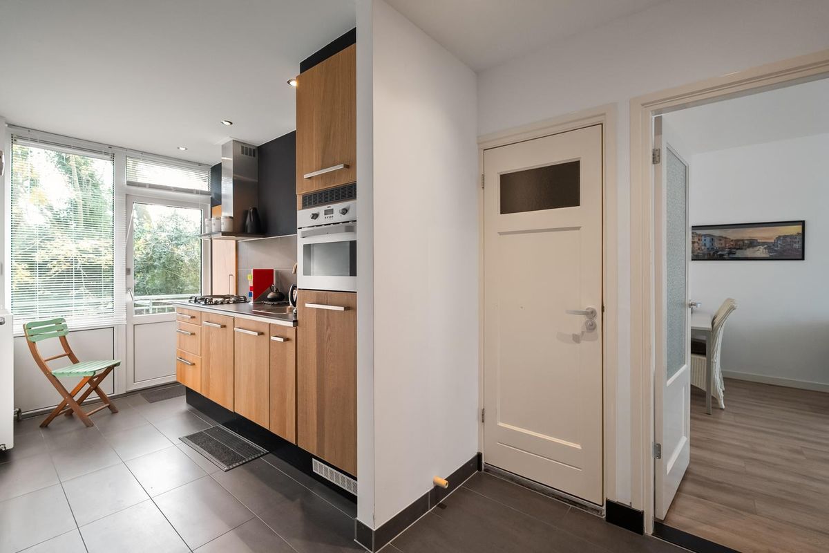 Deze knusse woning is gelegen op de 1e woonlaag. Via het portiek kom je binnen en heb je toegang tot het appartement via de nieuwe voordeur. Open indeling qua hal en keuken. De meterkast is voorzien van 8 groepen en dubbele aardlekschakelaar. De keuken heeft een houten inbouwkeuken voorzien van een koelkast, gaskookplaat, afzuigkap, combimagnetron en vaatwasser. Ideaal ook is de grote kast met uittreklades. Deur naar het balkon waar de ochtendzon op schijnt.