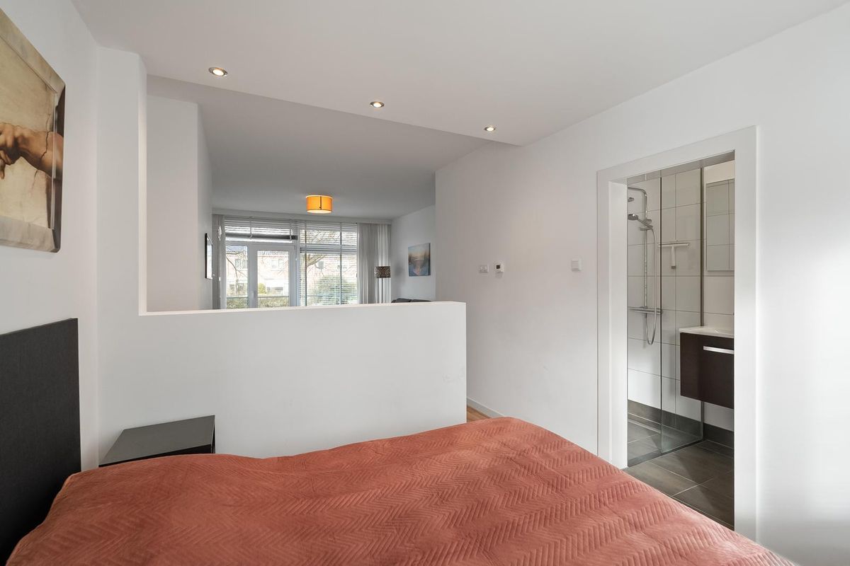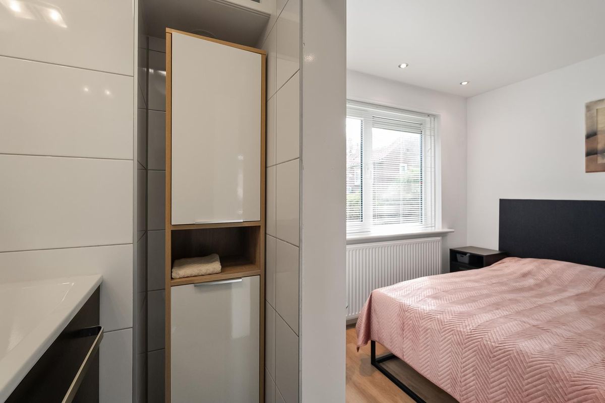 Vanuit deze slaapkamer direct toegang tot de mooie badkamer met een inloop douchecabine voorzien van een stort- en handdouche, wastafelmeubel met 2 kranen en kast.