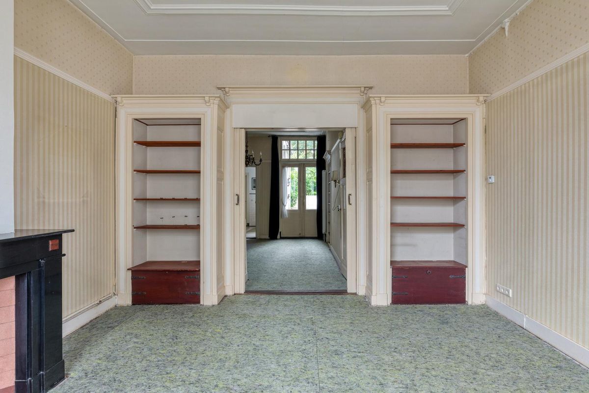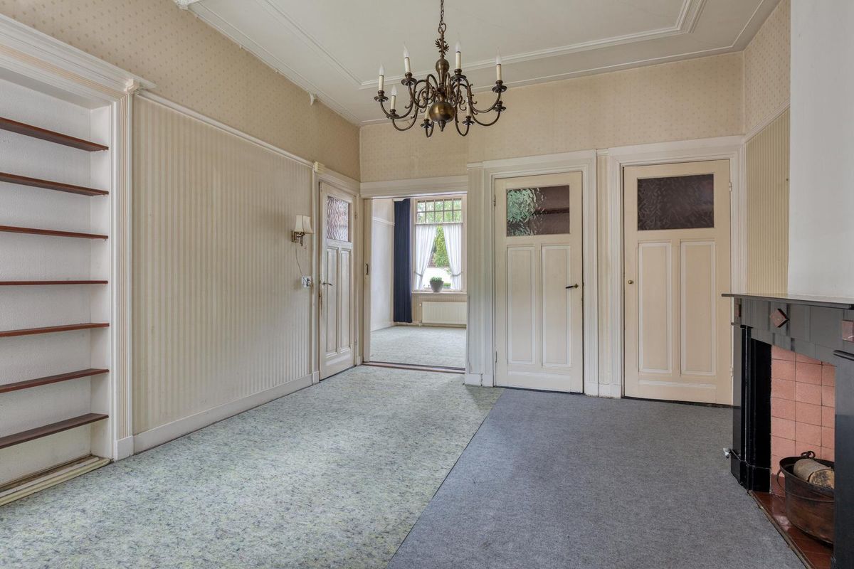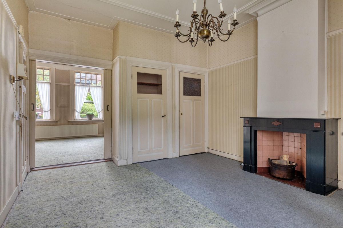 De sfeervolle woonkamer-en-suite is middels vaste kasten en schuifdeuren gescheiden in een voor- en achterkamer. De voorkamer is circa 20 m² groot. De voorkamer heeft een authentieke schouw, twee nissen (met boekenplanken) en twee originele schuiframen. Door de hoge ramen is er veel lichtinval in de voorkamer. De achterkamer is circa 18 m² groot. De achterkamer heeft een authentieke schouw, een vaste kast, een tweede diepe vaste kast, een nis (met boekenplanken) en tuindeuren. Vanuit de achterkamer is de keuken te bereiken.