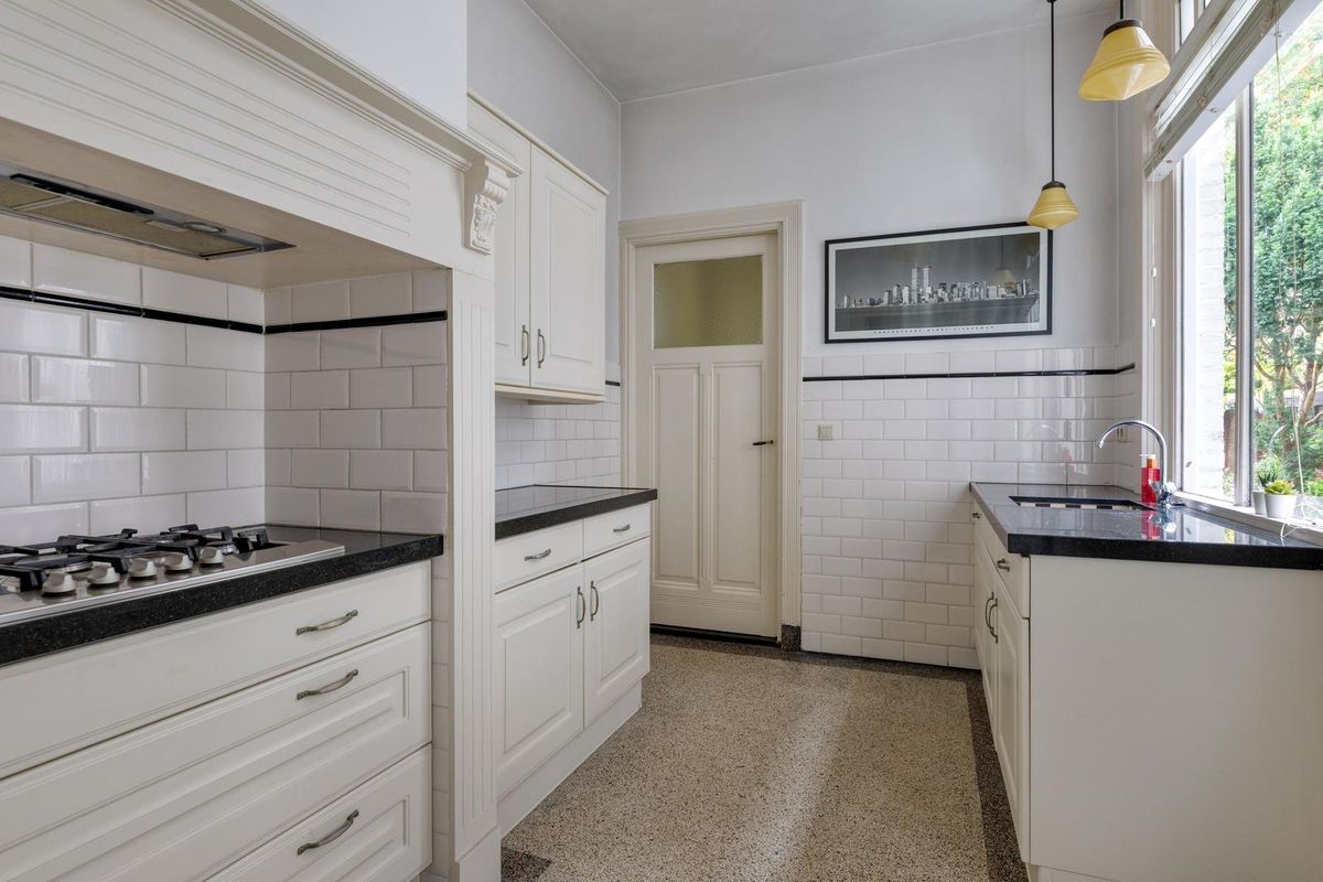 De keuken is voorzien van een keukenblok met een spoelbak, een keukenboiler en een vaatwasmachine. Het tweede keukenblok heeft een gasfornuis en een afzuigkap. De keuken heeft een originele granieten vloer. Vanuit de keuken zijn de inpandige berging en de tuin te bereiken.