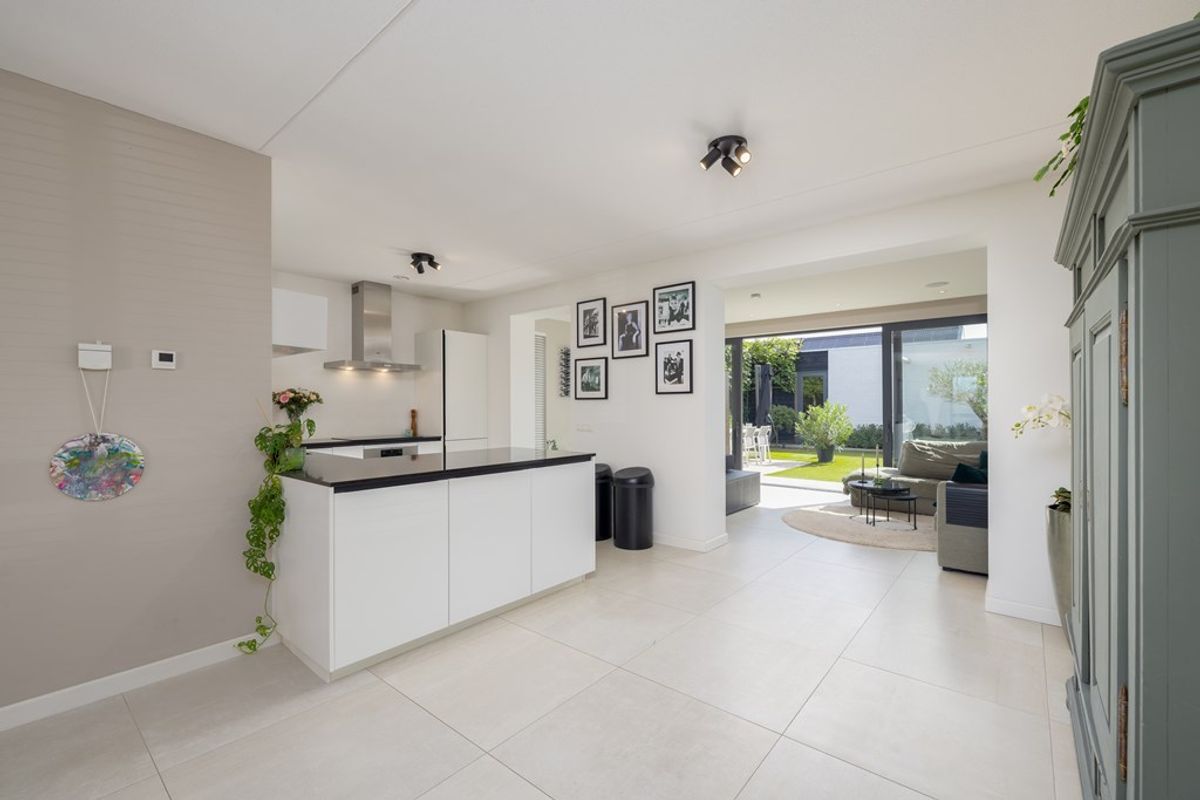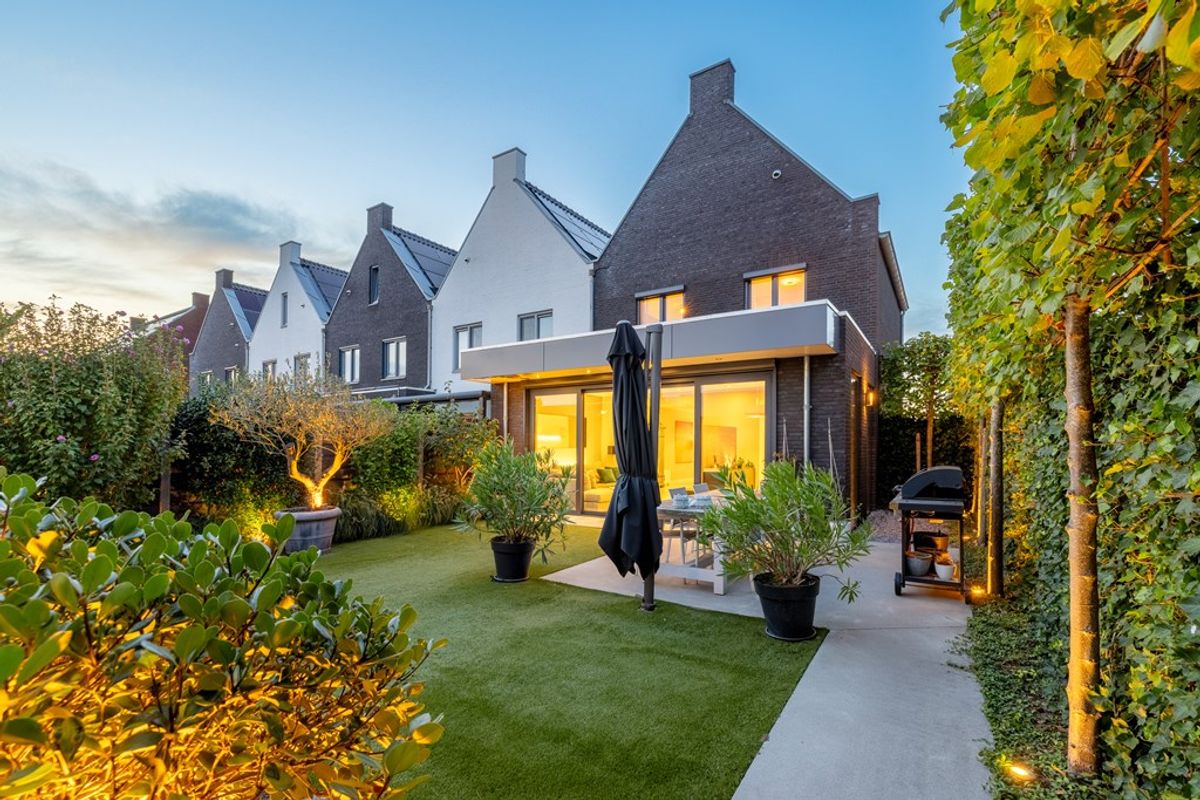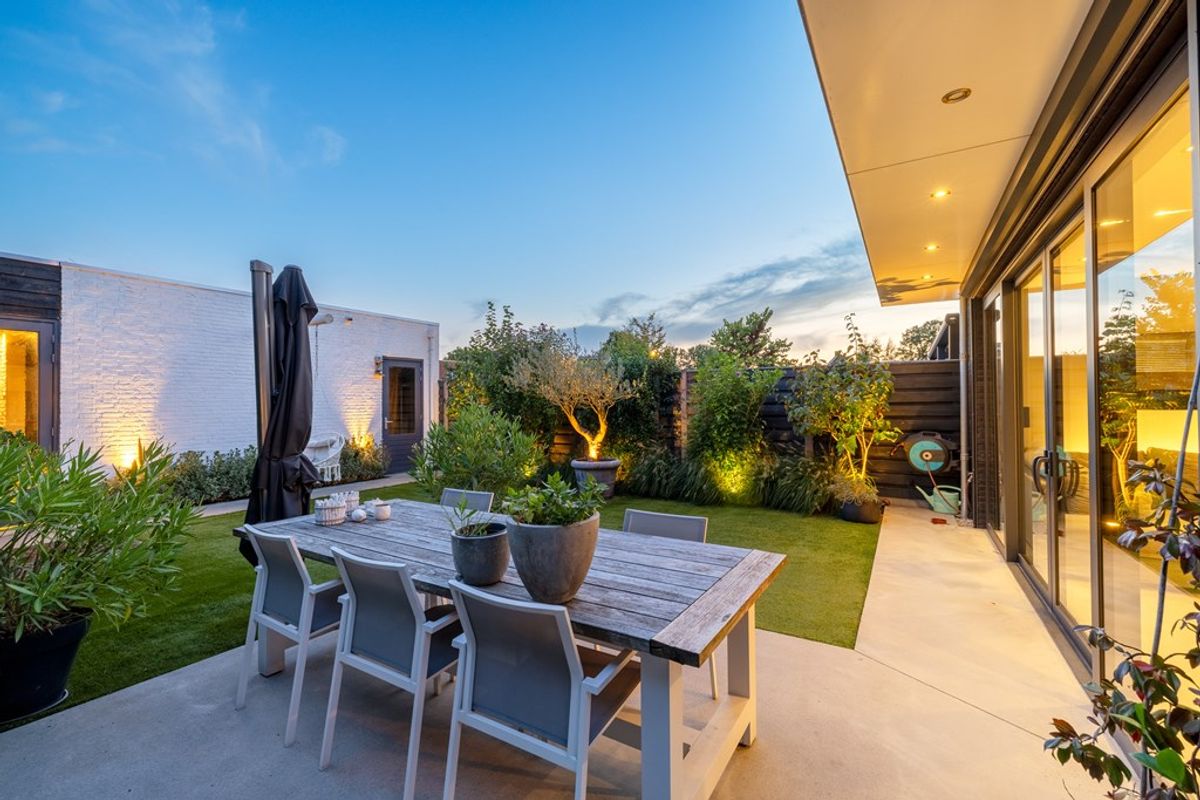 Direct achter de woning zorgen de grote schuifpuien voor een natuurlijke overgang tussen binnen en buiten. Aan het ruime terras is plek voor een lange eettafel of loungeset – de perfecte setting voor lange zomeravonden onder de moderne overkapping.