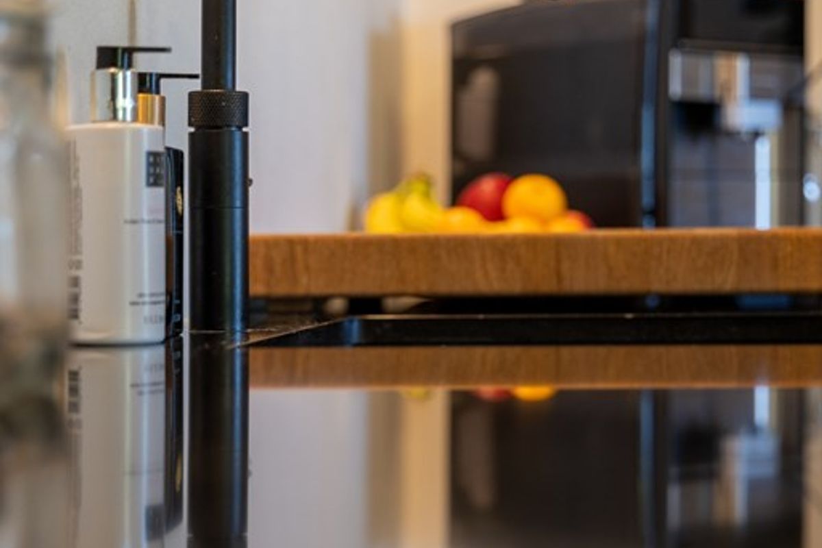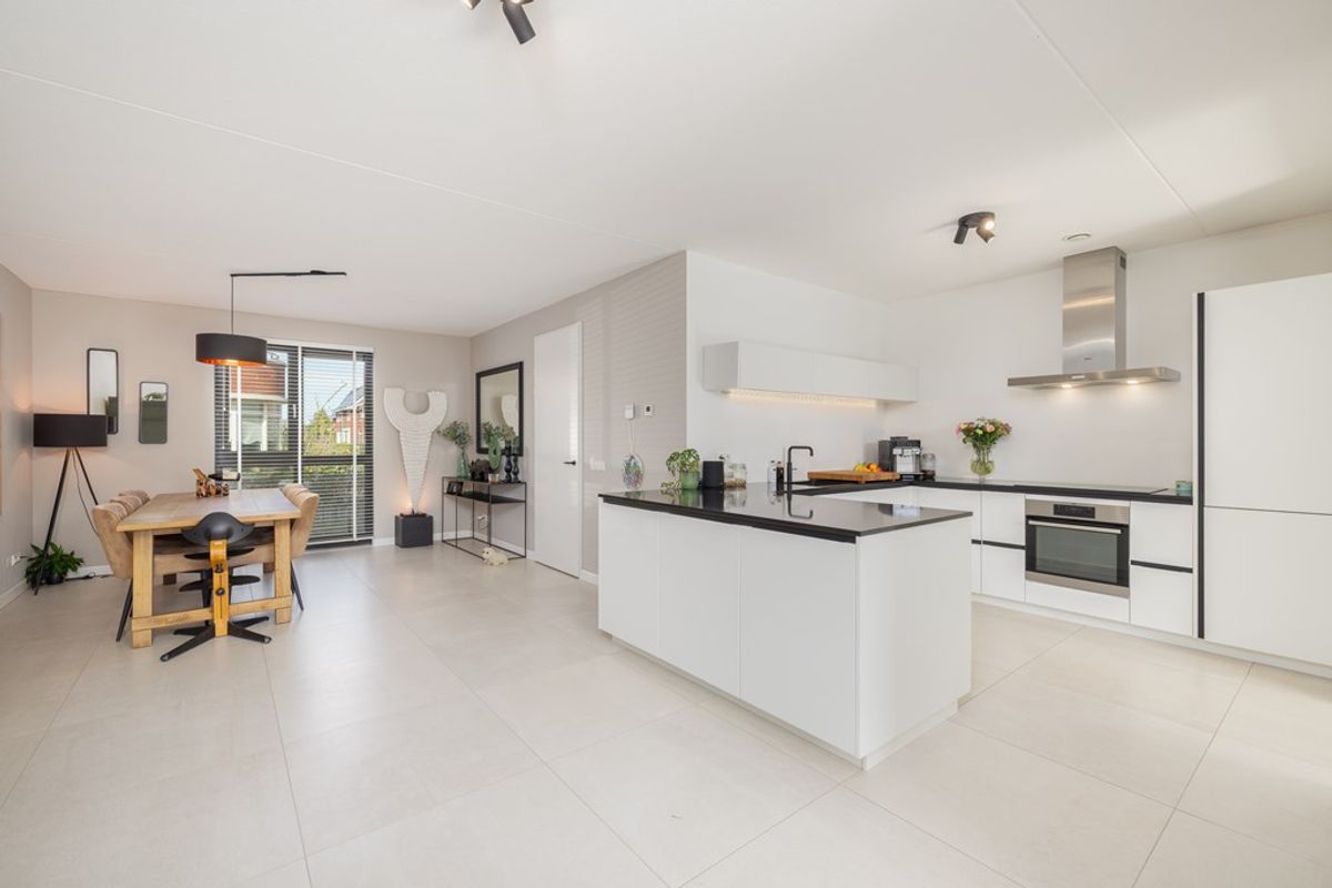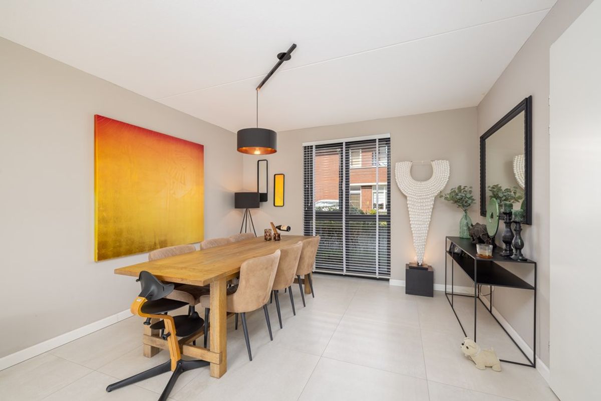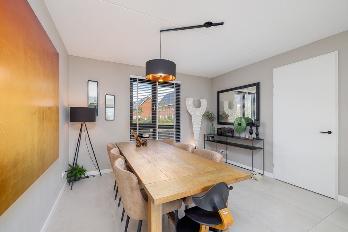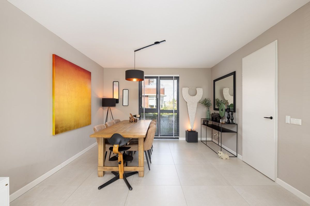 Via de entree kom je in de hal met garderobe, meterkast, toilet en trapopgang. De woonkamer, keuken en eetkamer vloeien hier in elkaar over tot één harmonieus geheel. Aan de voorzijde bevindt zich de ruime eetkamer, met plek voor lange diners en fijne gesprekken. De moderne keuken in het midden is voorzien van hoogwaardige inbouwapparatuur van AEG en vormt het hart van de woning. Aan de achterzijde ligt de lichte woonkamer, met openslaande deuren naar de tuin.