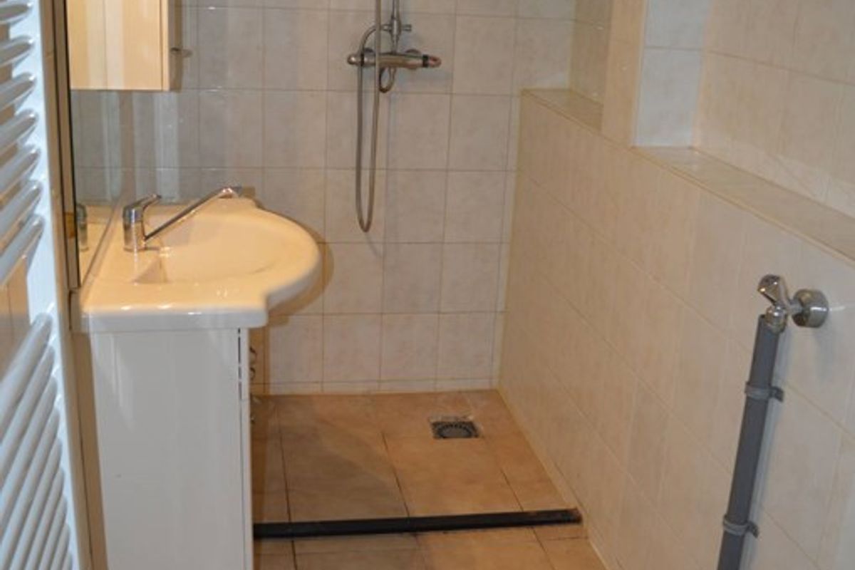 Ruime slaapkamer, badkamer met wastafel, toilet, wasmachineaansluiting en designradiator, provisiekast.