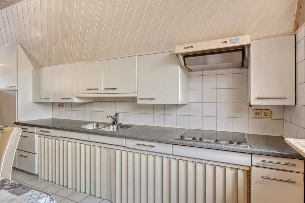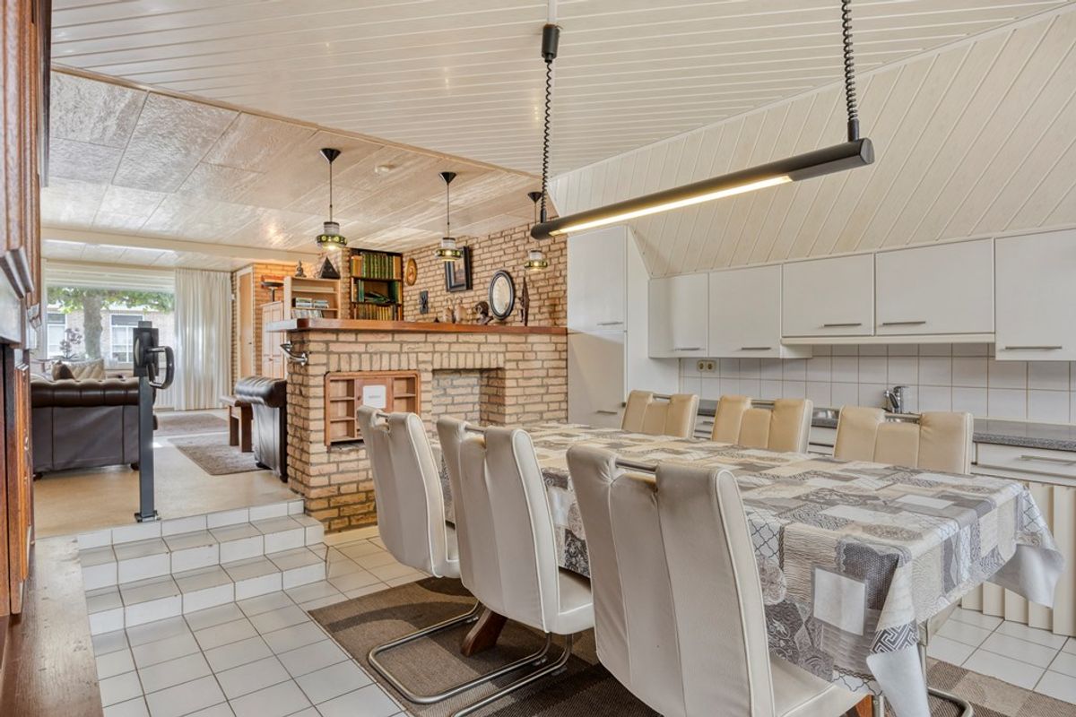 • Woonkamer met open keuken: aan de straatzijde de woonkamer. Deze ligt hoger (soort opkamer) omdat onder de woonkamer deels een kelder ligt (bereikbaar via een luik aan de zijkant). De muren zijn deels afgewerkt met schoonmetselwerk en deels met granol. In de keuken is tevens de cv-kast met de HR-combi VHR Vaillant 2016 CW4. Het keukengedeelte ligt lager en is echt een leefkeuken. Het keukenblok is een verlaagd keukenblok omdat dit bestemd was voor mindervalide. Apparatuur o.a.: dubbele spoelbak, elektrische kookplaat met afzuigkap en een koelkast. Zowel in de woonkamer als keuken een systeemplafond.