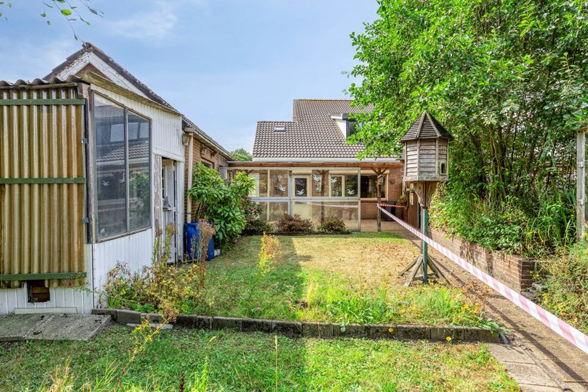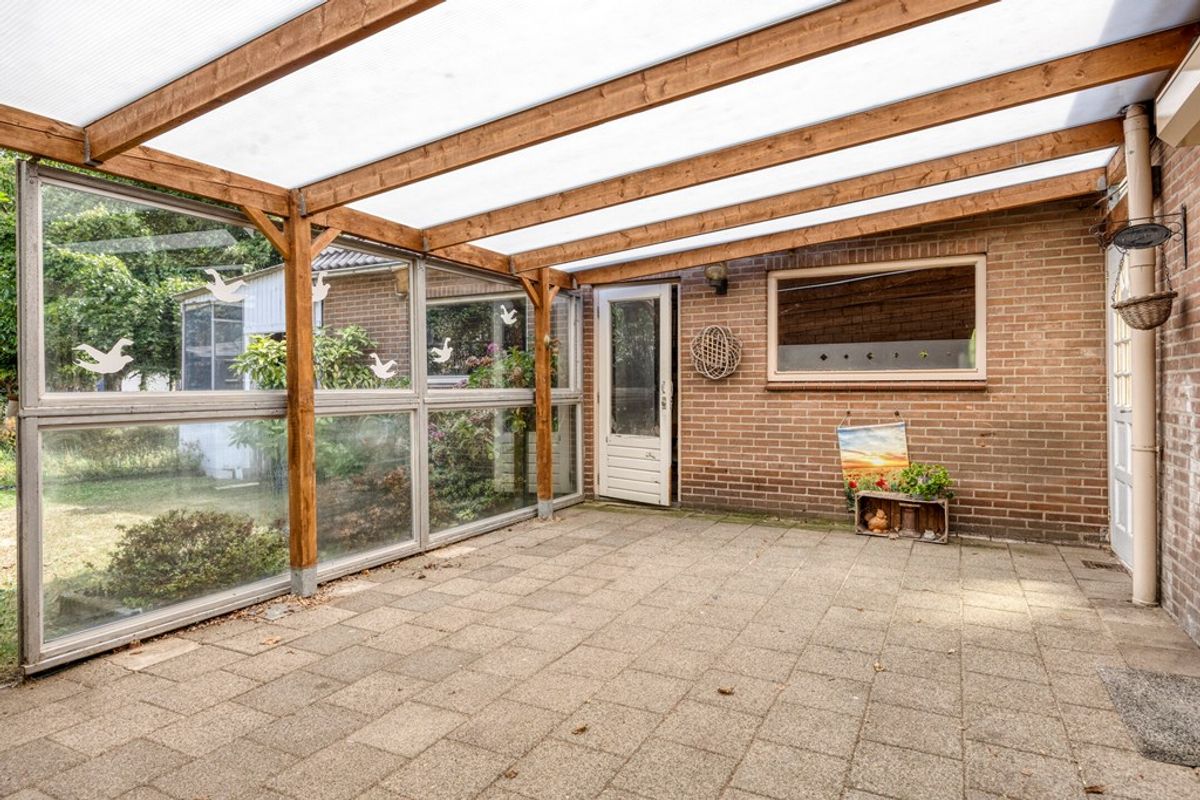 • Achtertuin en overkapping: direct achter de woning een ruim terras met overkapping en een normaal aangelegde tuin. Bij achterdeur en keukenraam een rolluik