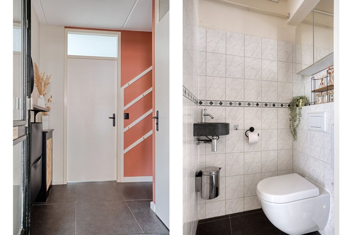 …met deuren naar de toiletruimte (met wandcloset en wasbakje), meterkast (drie fasen aansluiting en krachtstroom in de garage) en de woonkamer.