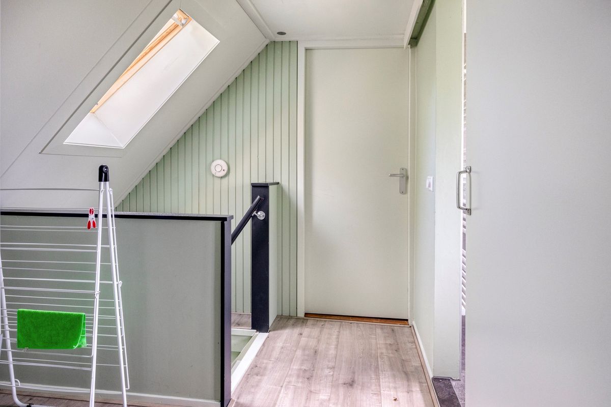 Overloop met 2 slaapkamers en de tweede badkamer voorzien van een wastafel, toilet en douchehoek.