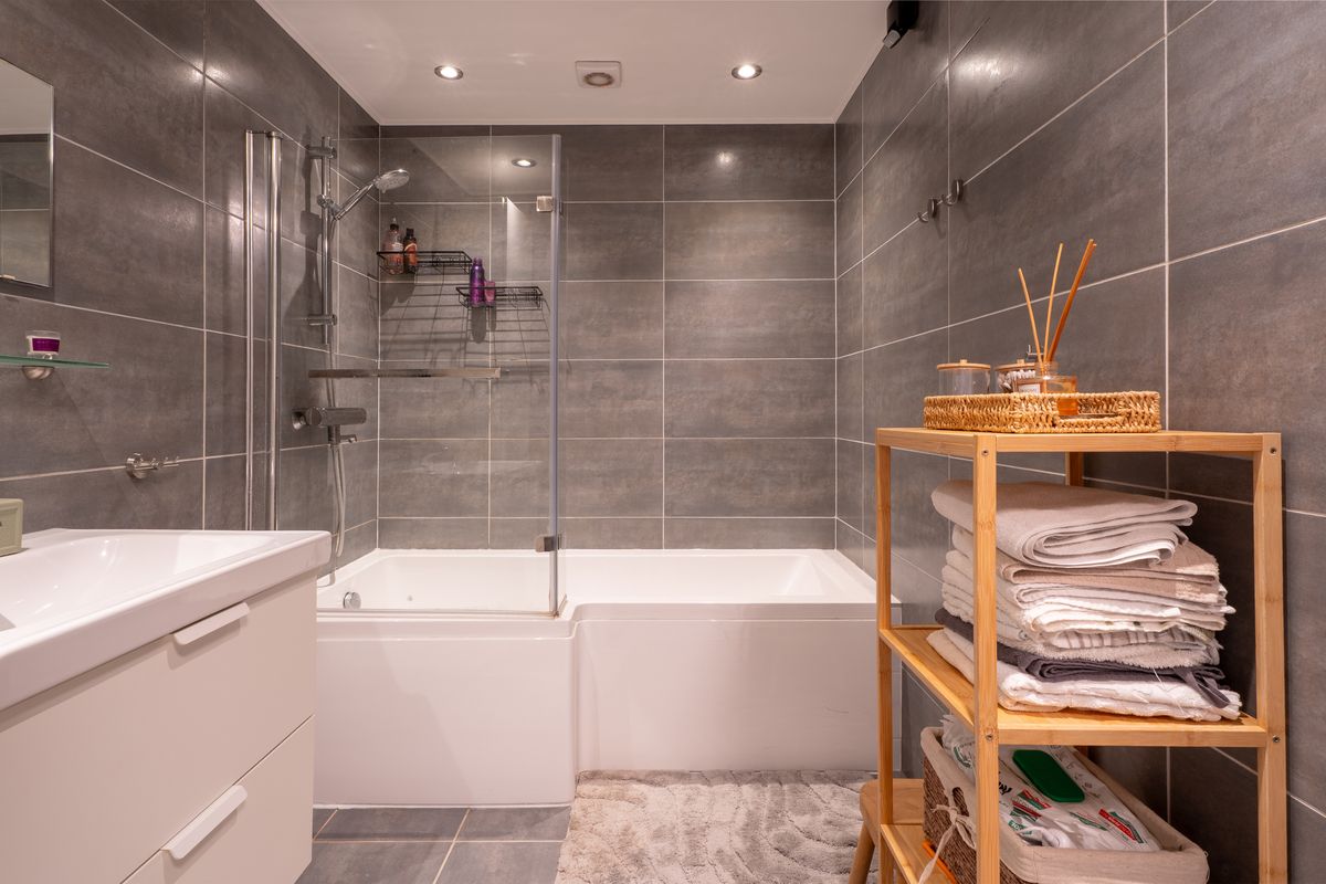 De badkamer is volledig betegeld en beschikt over een ligbad, wastafelmeubel, mechanische ventilatie en een verlaagd plafond met inbouwspotjes. Het separate toilet is deels betegeld en voorzien van een hangend toilet, fonteintje én een bidet.