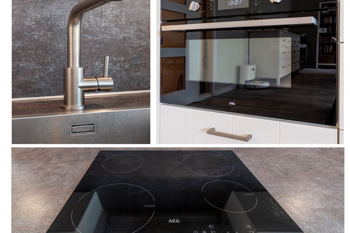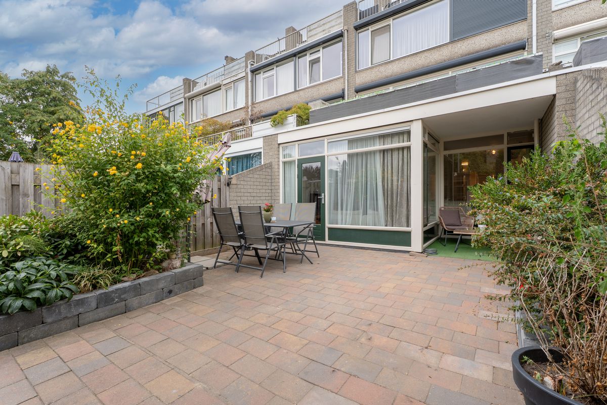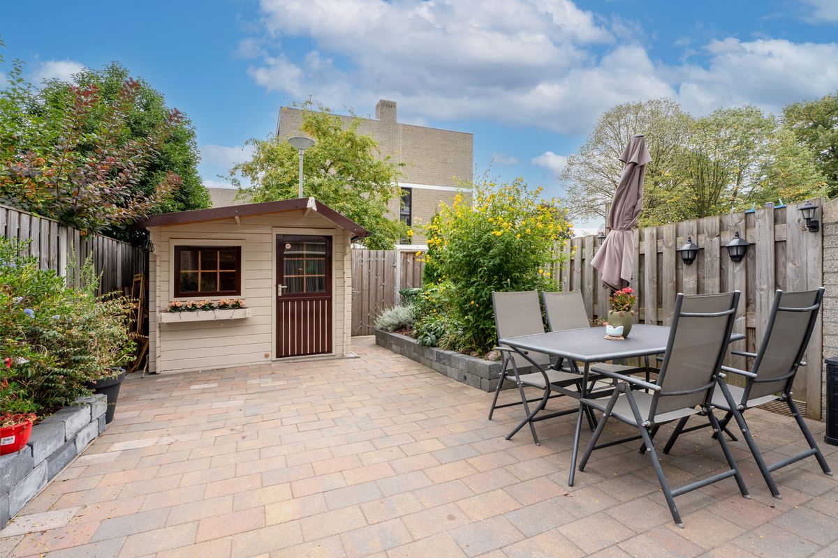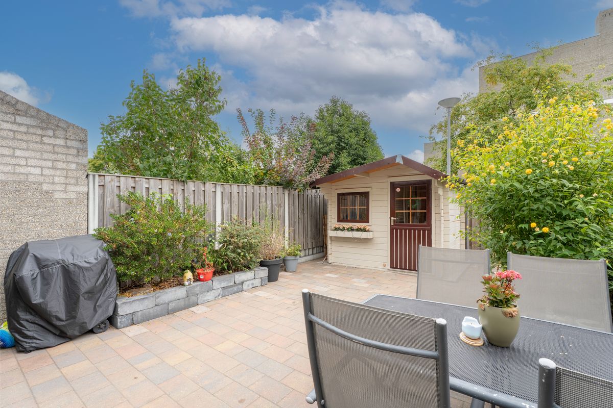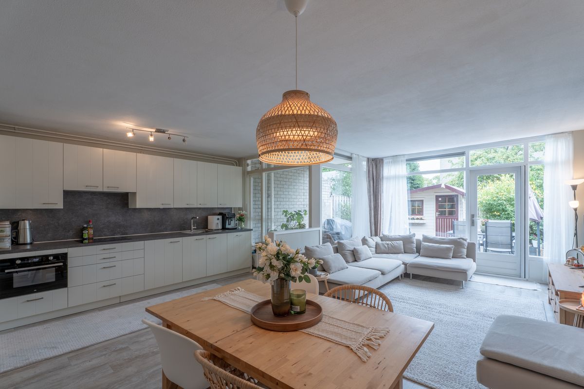 De open keuken is uitgerust met een 4-zone inductiekookplaat, afzuiging, koel-vriescombinatie, combimagnetron en vaatwasser. Er is voldoende ruimte voor een eethoek en via de keuken loop je door naar de lichte woonkamer met grote raampartijen. Vanuit de woonkamer stap je zo de zonnige tuin in, gelegen op het zuidoosten. De tuin is grotendeels betegeld, voorzien van houten schuttingen, een brede tuindeur en een houten schuur. Direct aan de woning is er bovendien een overdekt gedeelte en een achterom.