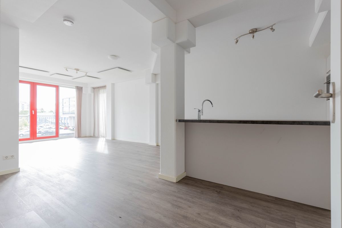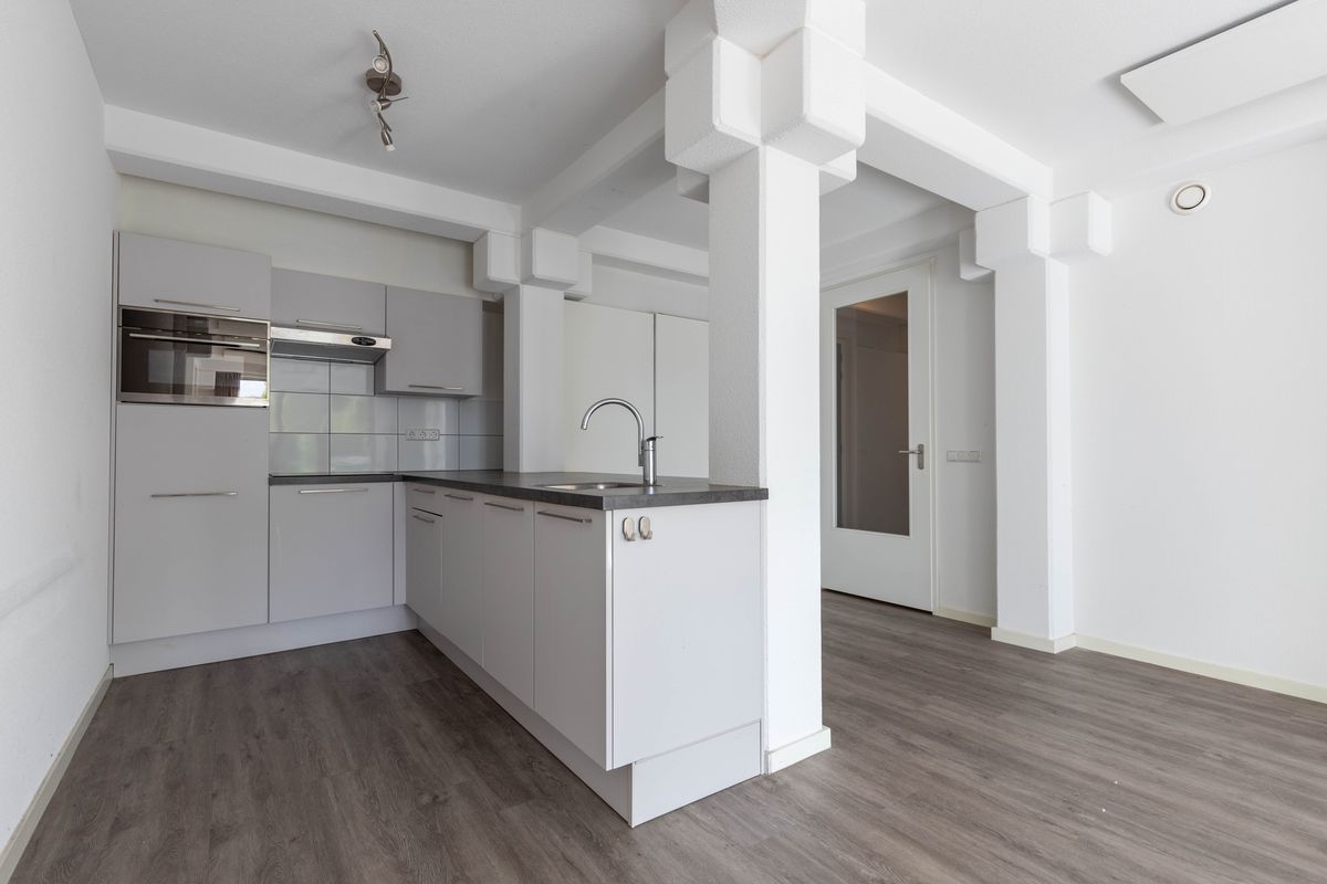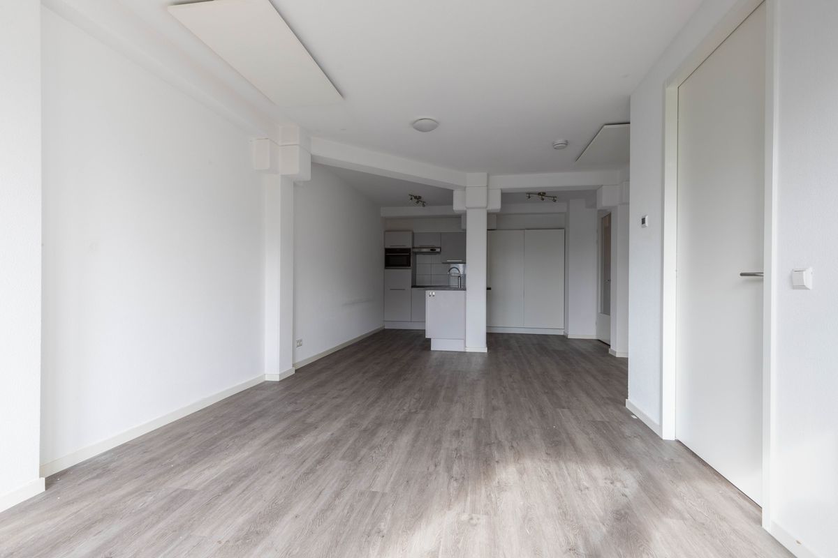 Meterkast. Entree: Hal. Modern vrijhangend toilet. Vanuit de hal is er toegang tot de royale woonkamer met een moderne open keuken voorzien van diverse inbouwapparatuur, door de grootte raampartijen heeft de woonkamer veel lichtinval. Aan de voorzijde van het appartement bevindt zich de royale slaapkamer. Inpandige berging met aansluiting wasmachine en boiler. Moderne geheel betegelde badkamer voorzien van wastafel in meubel en inloopdouche.
