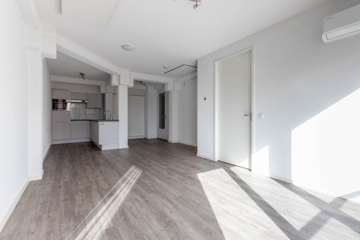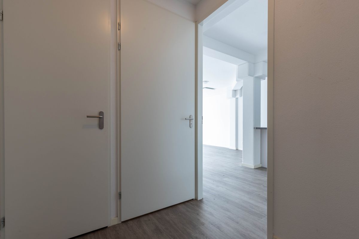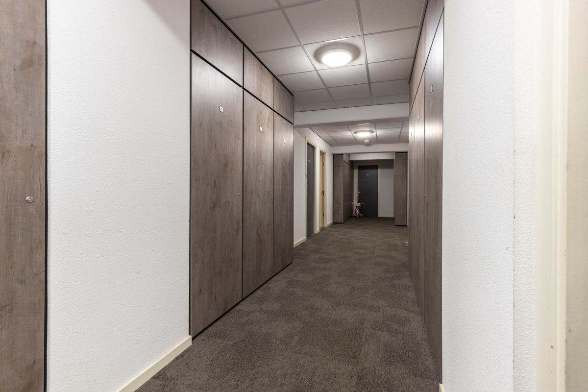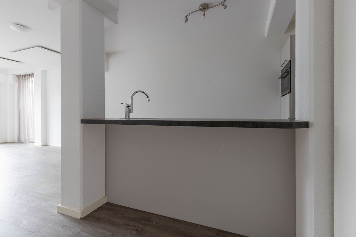 Meterkast. Entree: Hal. Modern vrijhangend toilet. Vanuit de hal is er toegang tot de royale woonkamer met een moderne open keuken voorzien van diverse inbouwapparatuur, door de grootte raampartijen heeft de woonkamer veel lichtinval. Aan de voorzijde van het appartement bevindt zich de royale slaapkamer. Inpandige berging met aansluiting wasmachine en boiler. Moderne geheel betegelde badkamer voorzien van wastafel in meubel en inloopdouche.