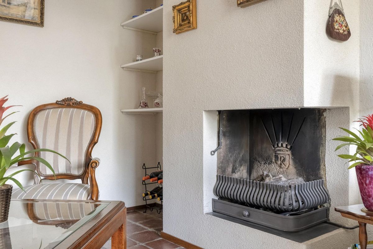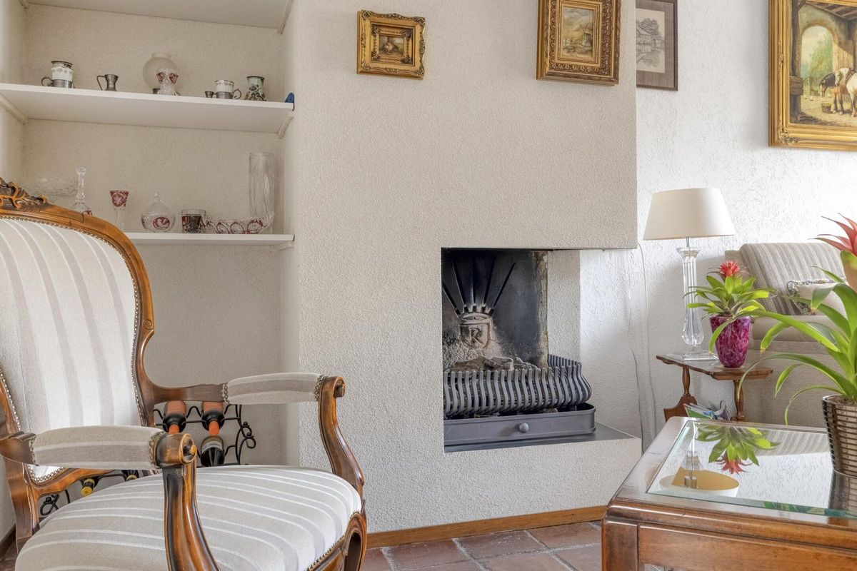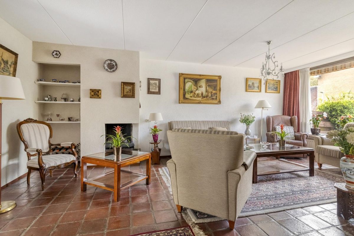 * De lichte en royale woonkamer met toegang tot de tuin is voorzien van grote raampartijen en heeft een open haard,