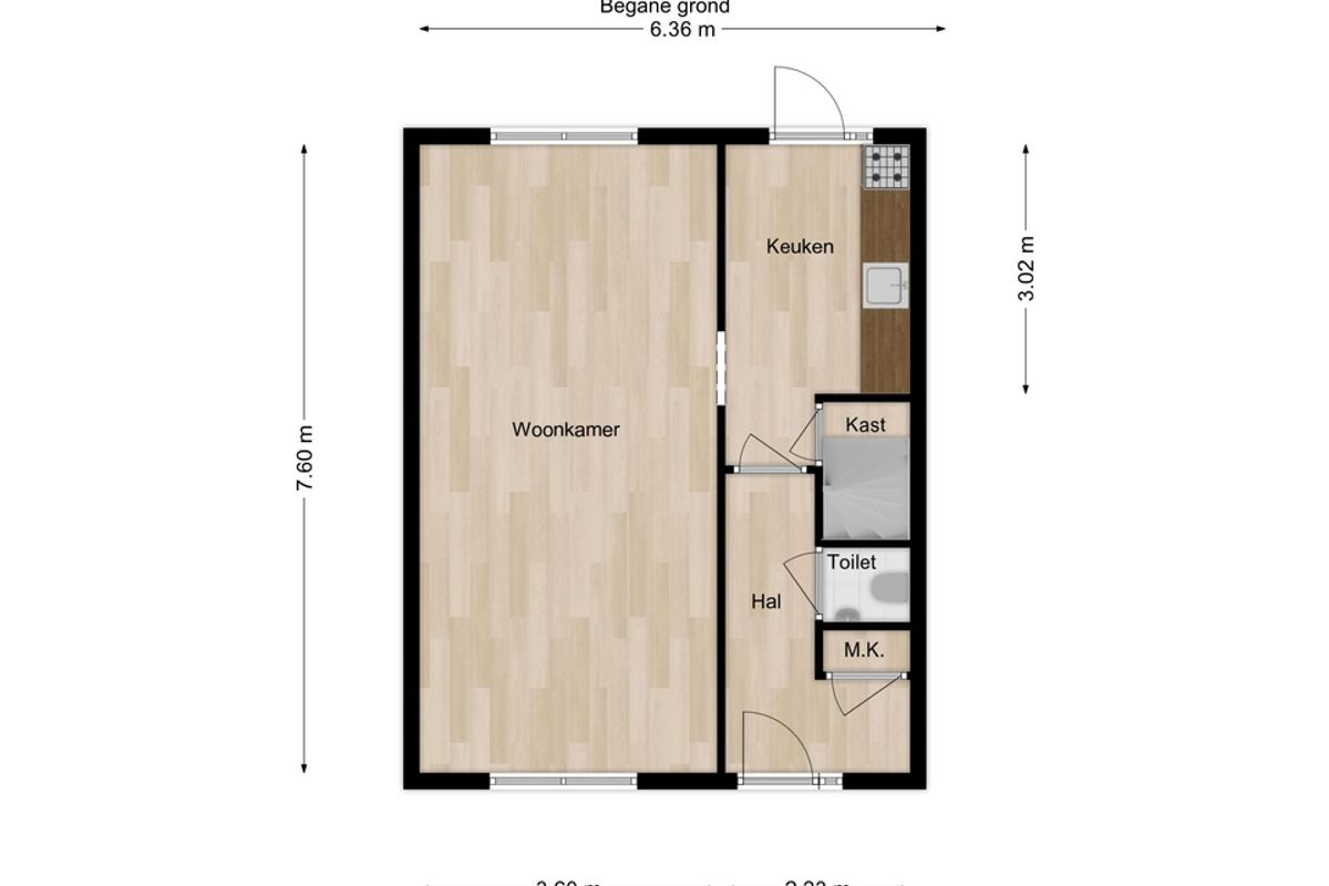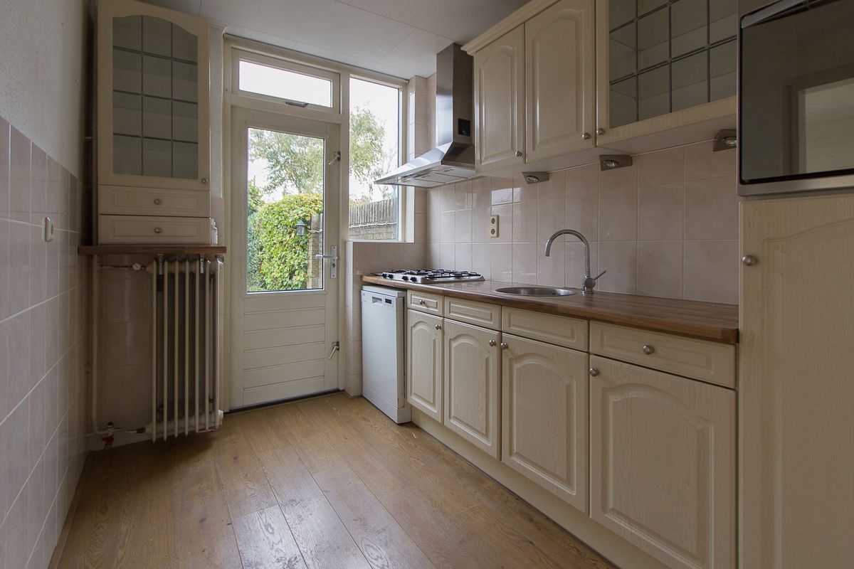 Entree met hal, meterkast, toiletruimte (voorzien van staand toilet en fonteintje) en trapopgang naar de verdieping. De lichte woonkamer biedt een gezellige leefruimte met uitzicht op de tuin. De dichte keuken heeft een rechte opstelling en is voorzien van diverse inbouwapparatuur, waaronder een 4-pits gasstel, oven, koelkast, vaatwasser en afzuigkap. Vanuit de keuken is de achtertuin bereikbaar.